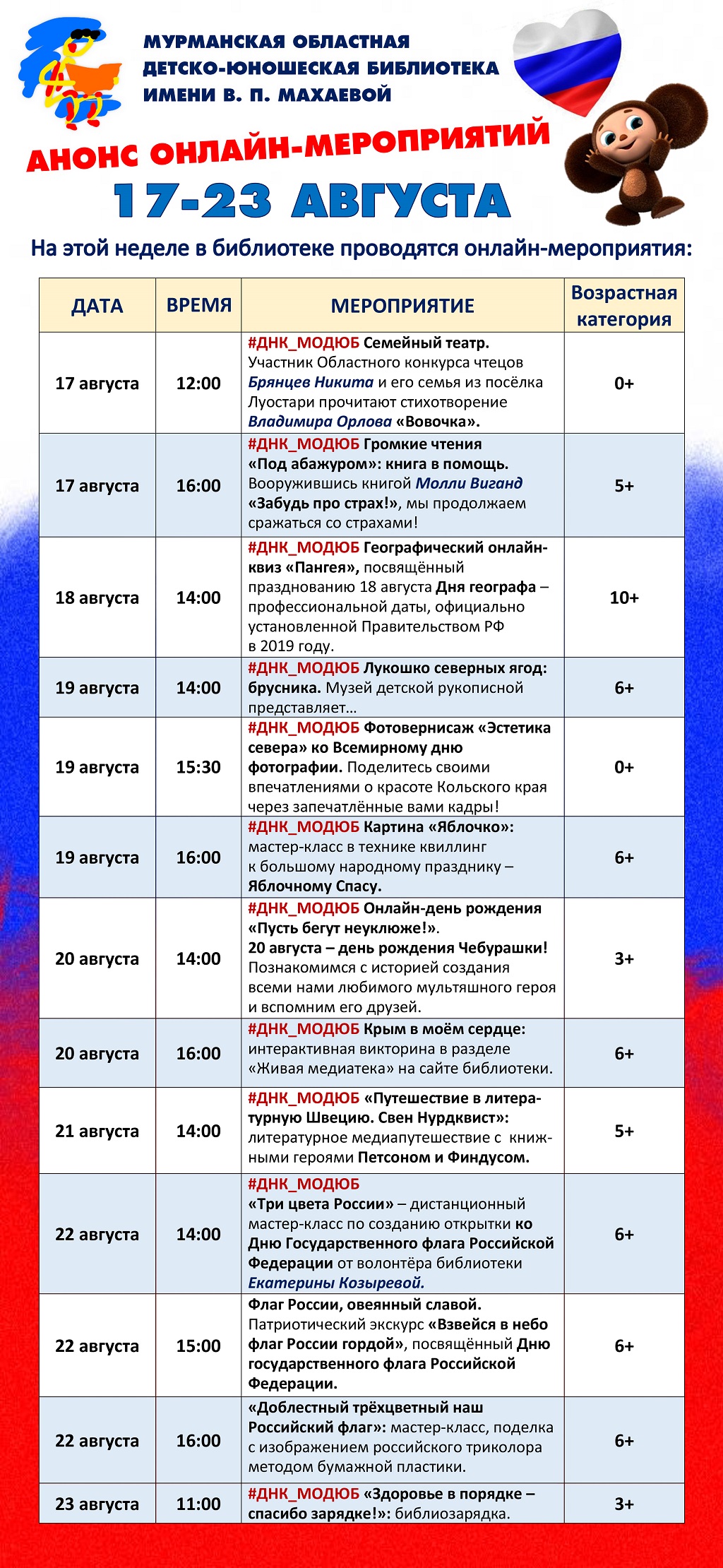 Дорогие читатели Областной детско-юношеской библиотеки имени В. П. Махаевой. Предлагаем ознакомиться с программой онлайн-мероприятий с 17 по 23 августа, которые будут размещены на сайте во вкладке «Новости»