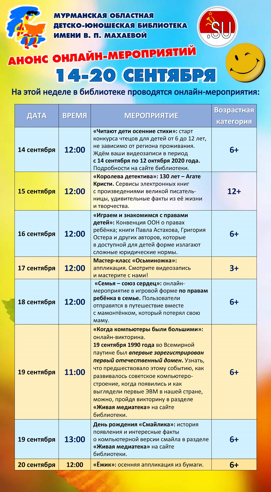 Дорогие читатели Областной детско-юношеской библиотеки имени В. П. Махаевой. Предлагаем ознакомиться с программой онлайн-мероприятий с 14 по 20 сентября, которые будут размещены на сайте во вкладке «Новости»