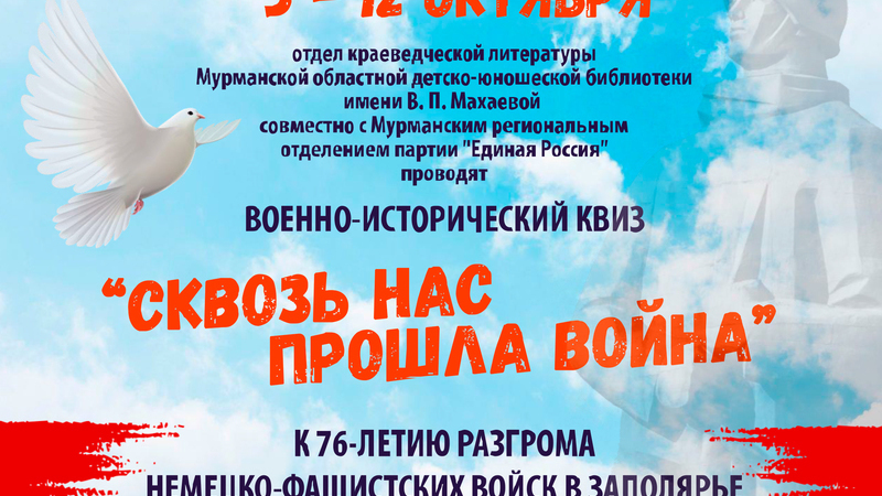 В преддверии празднования 76-ой годовщины разгрома немецко-фашистских войск в Заполярье отдел краеведческой литературы Мурманской областной детско-юношеской библиотеки имени В. П. Махаевой совместно с Мурманским региональным отделением партии «Единая Россия» проводит военно-исторический квиз «Сквозь нас прошла война»