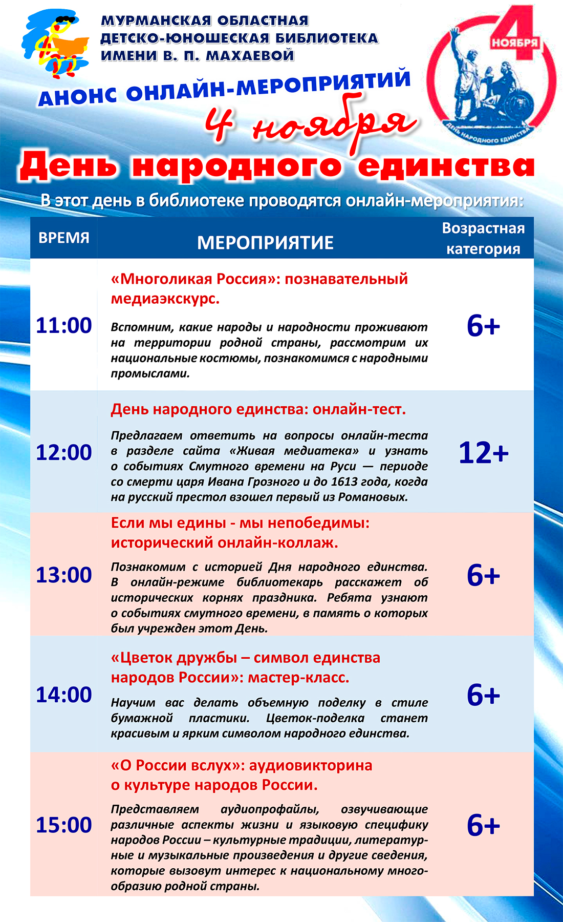 Также будет предложено совершить виртуальное путешествие по многонациональной России и вспомнить, какие народы и народности проживают на территории нашей страны, познакомиться с их культурой и народными промыслами. И увидеть то общее, что всех объединяет.