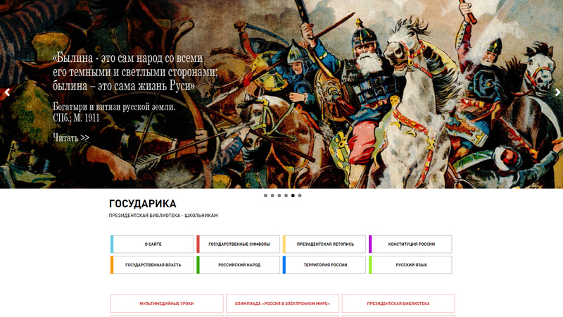 В помощь школьникам, желающим изучить историю российской государственности, а также исследовать русский язык с точки зрения статуса государственного языка Российской Федерации, Президентская библиотека имени Б. Н. Ельцина разработала информационно-образовательный проект «Государика».