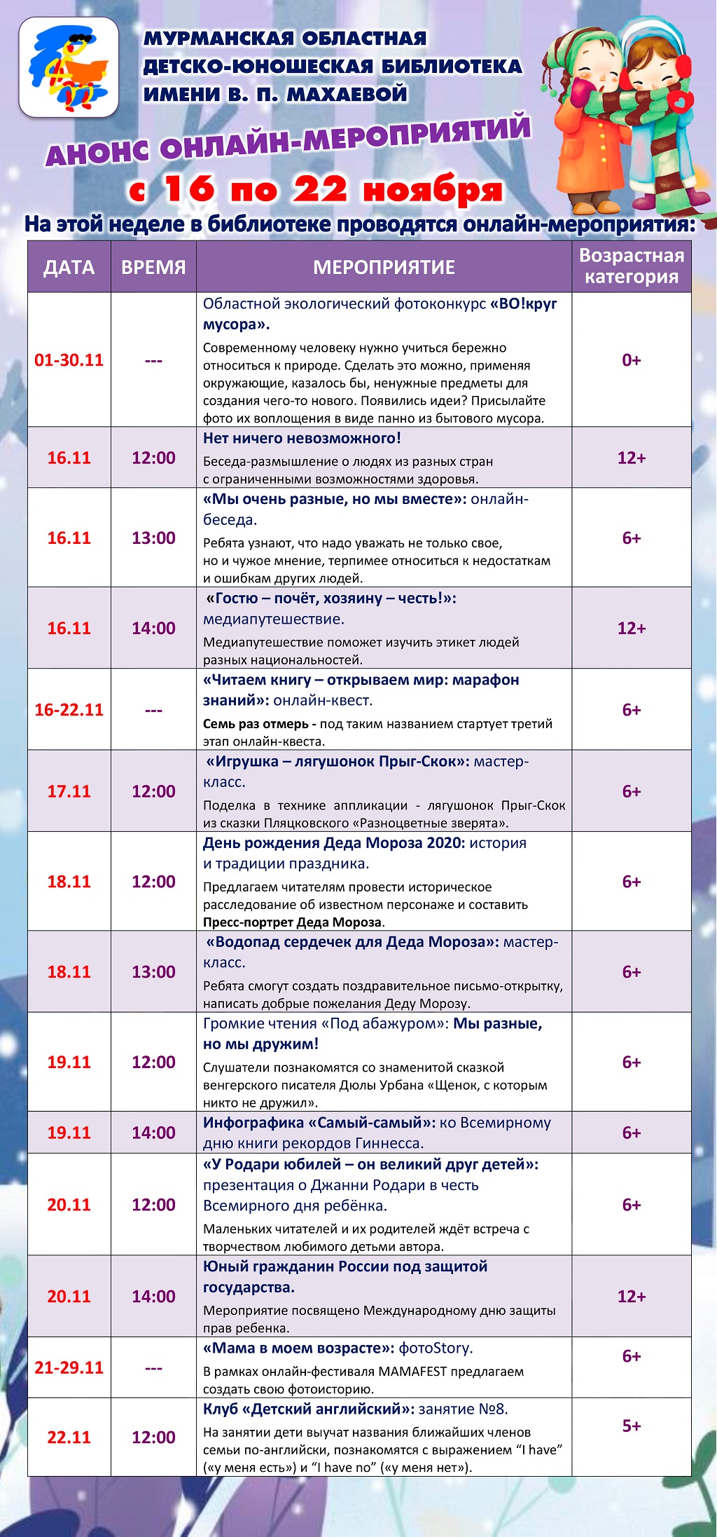 Дорогие посетители, знакомьтесь с программой онлайн-мероприятий с 16 по 22 ноября