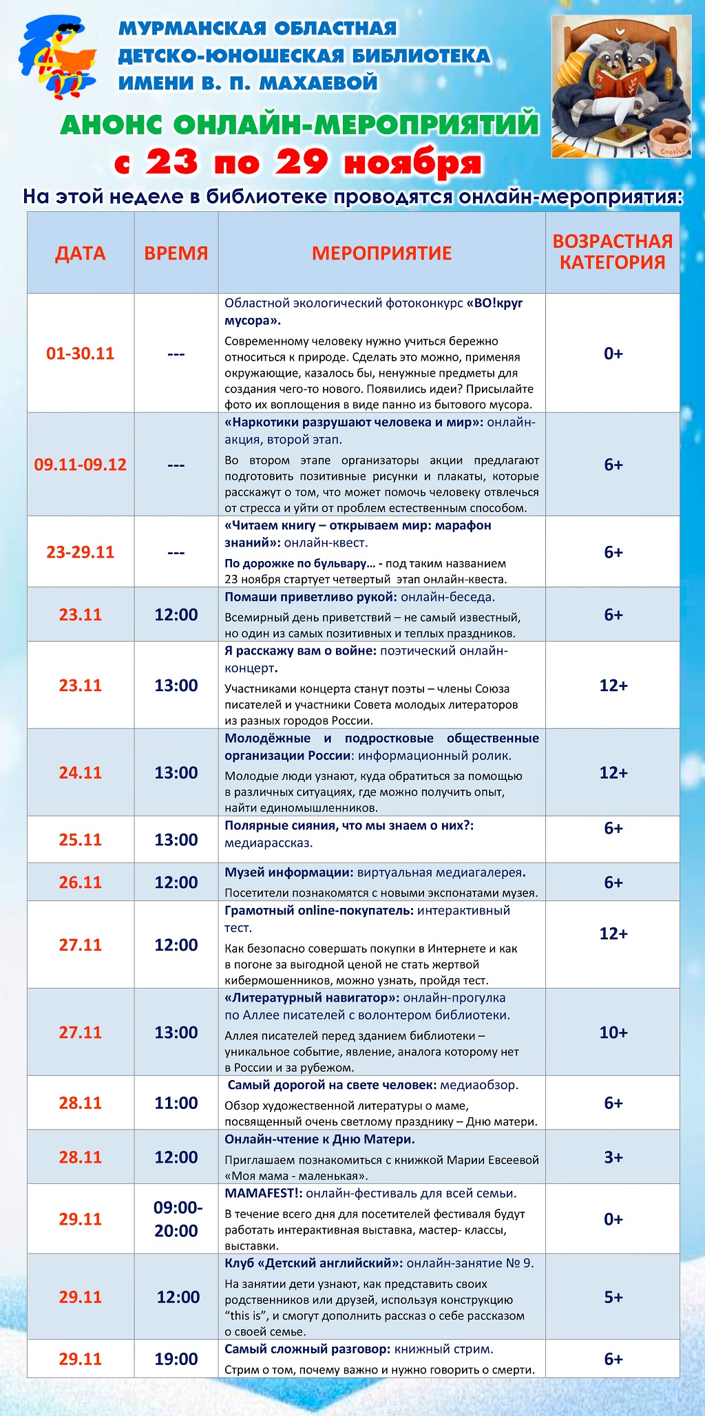 Уважаемые посетители, знакомьтесь с программой онлайн-мероприятий с 23 по 29 ноября