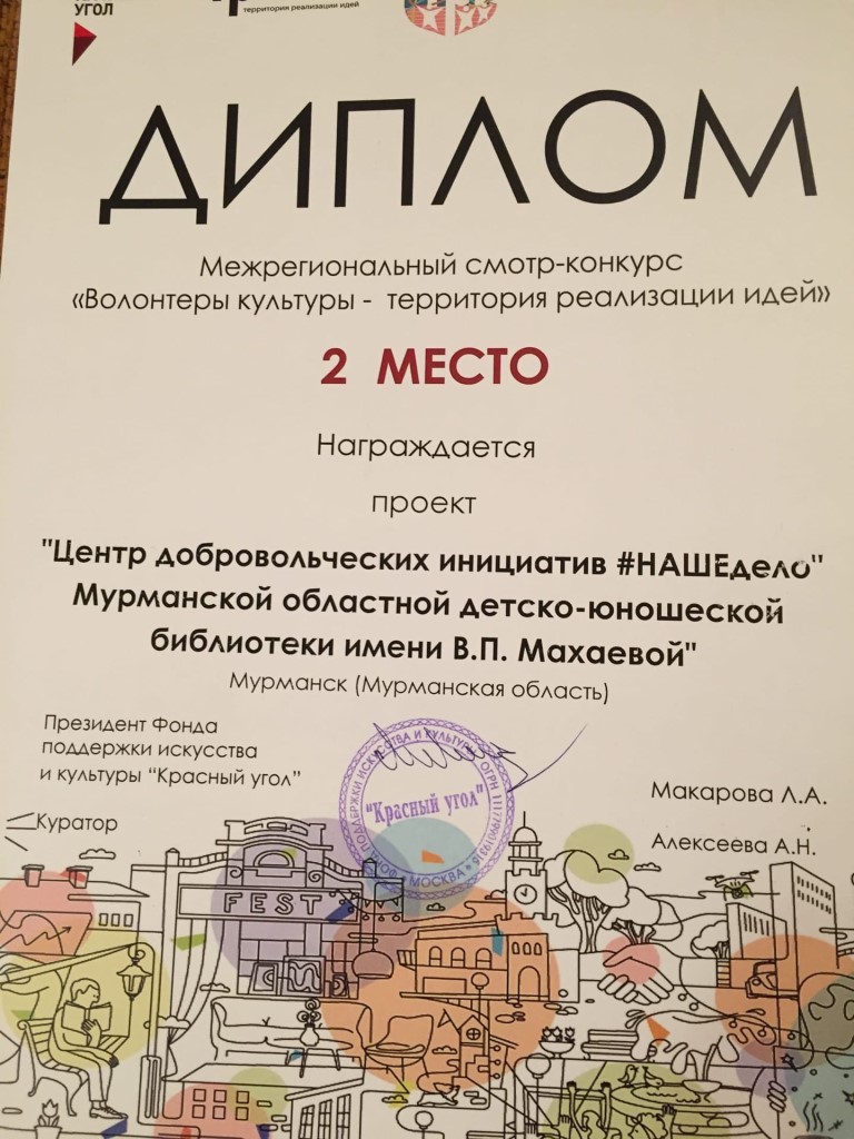 Мурманская областная детско-юношеская библиотека имени В. П. Махаевой представила проект «Центр добровольческих инициатив #НАШЕдело», ставший победителем Межрегионального смотра-конкурса «Волонтеры культуры – территория реализации идей».