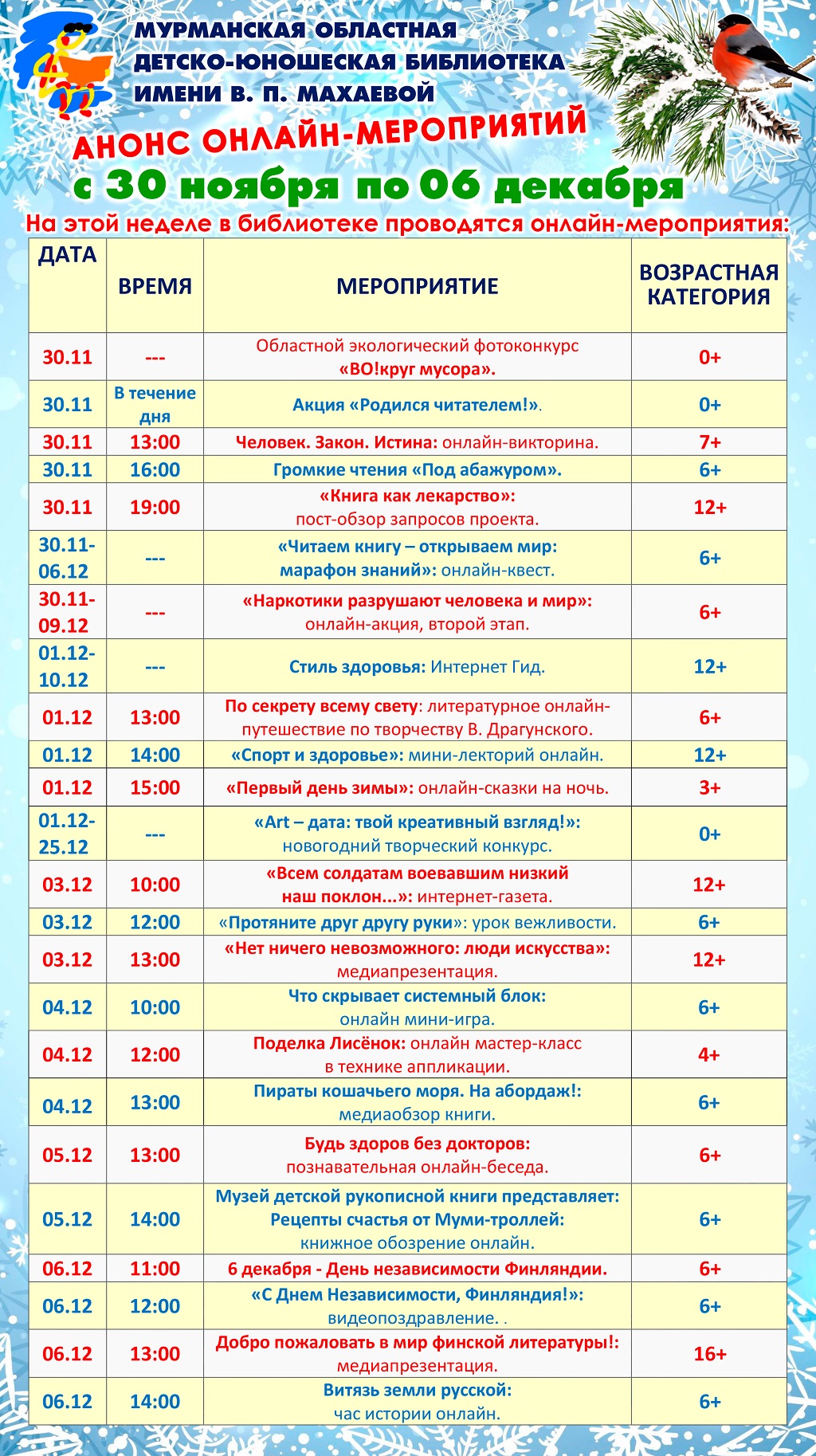 Дорогие посетители, знакомьтесь с программой онлайн-мероприятий с 30 ноября по 6 декабря