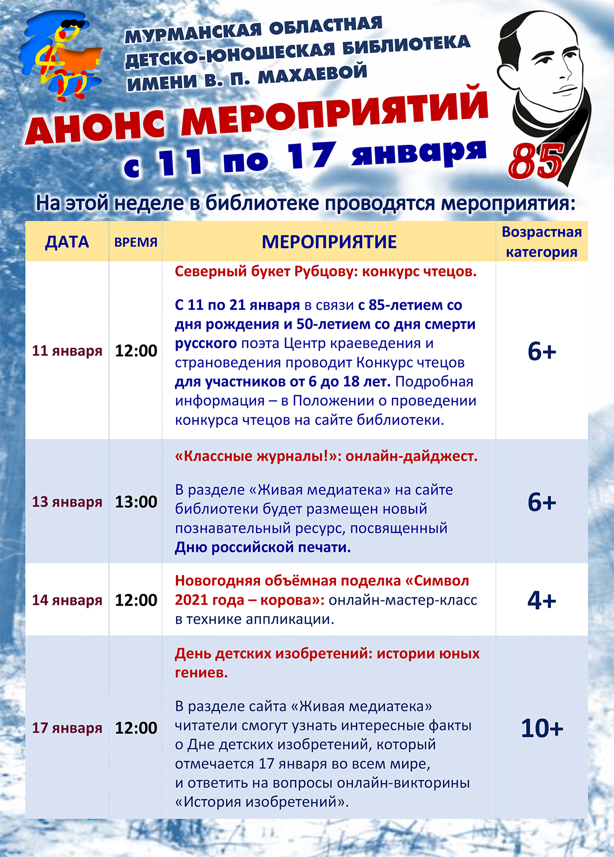 Дорогие посетители, знакомьтесь с программой онлайн-мероприятий с 11 по 17 января