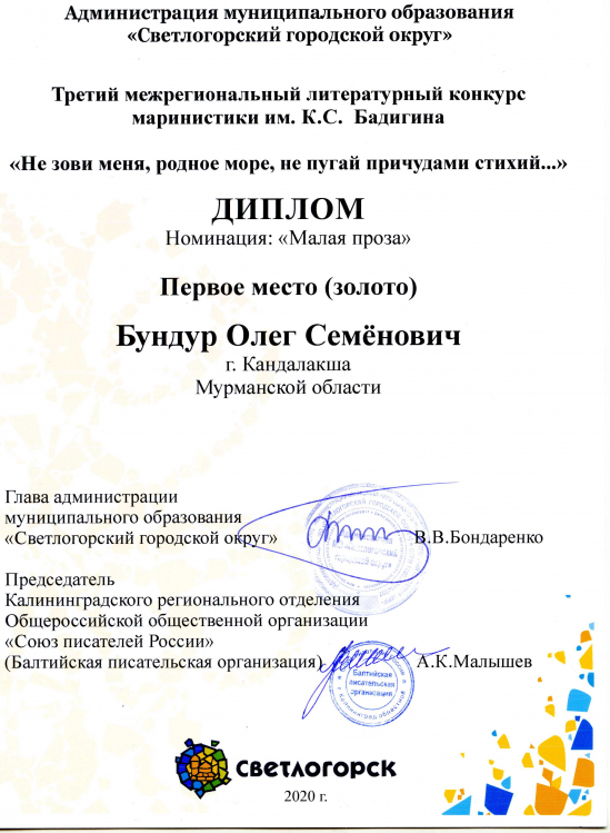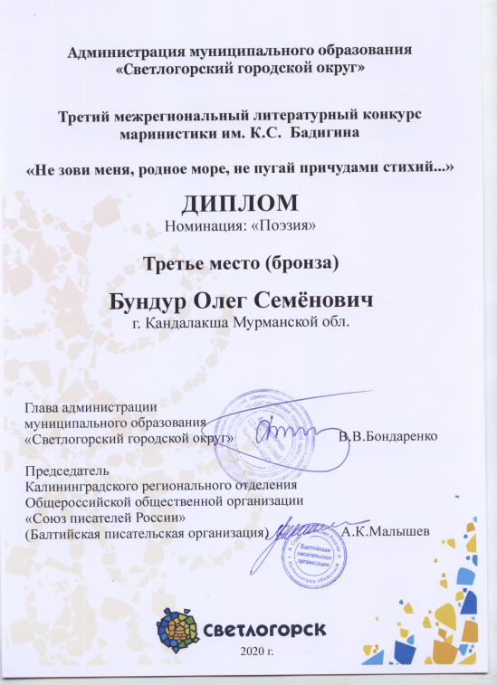 Олег Бундур стал дипломантом Третьего заочного межрегионального литературного конкурса маринистики имени Константина Сергеевича Бадигина 2020. В номинации «Малая проза» он занял Первое место (золото),