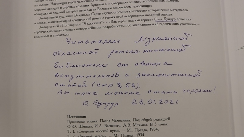Благодаря Олегу Семеновичу фонд библиотеки пополнится книгой Владислава Серова «Лётчики-герои. Спасение челюскинцев» из серии «Исторический комикс».