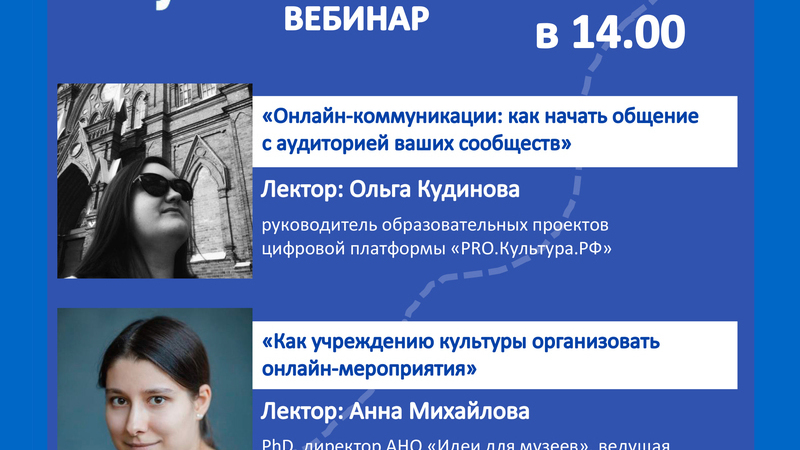 Лекторами выступят Анна Михайлова, PhD, директор АНО «Идеи для музеев», ведущая вебинаров платформы «PRO.Культура.РФ», член ИКОМ, соавтор книги «Музей в цифровую эпоху: перезагрузка» и Ольга Кудинова, руководитель образовательных проектов цифровой платформы «PRO.Культура.РФ»