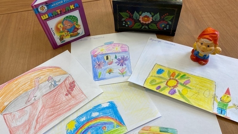 Прислушиваясь к разным звукам, и заглядывая в необычную шкатулку, ребята обнаружили жужжащие и шуршащие стихи Андрея Усачева. Вместе со стихами поэта они посчитали ворон, построили домик для гнома, познакомились с азбукой Бабы-яги, прочитали сказку «Живот-животок». В конце встречи ребятам было дано чудо-задание: придумать и нарисовать то, что лежит в волшебной шкатулке Андрея Усачева.
