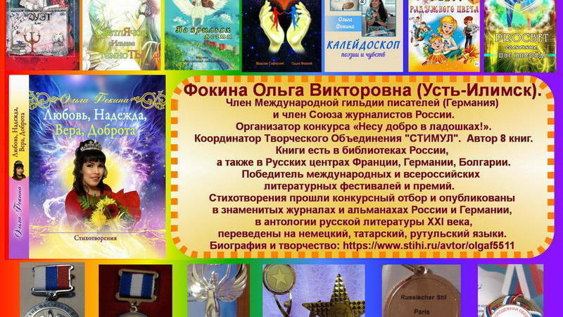 Конкурс посвящен юбилею члена Международной гильдии писателей (Германия), Интернационального Союза писателей, поэтов и драматургов, Союза журналистов России, поэта, прозаика Фокиной Ольги Викторовны, а также 25-летию творческой деятельности члена Международной гильдии писателей (Германия), Международного Союза писателей «Новый Современник», Интернационального Союза писателей, поэтов и драматургов, композитора, поэта, музыканта, автора-исполнителя Сафиулина Максима Сергеевича.