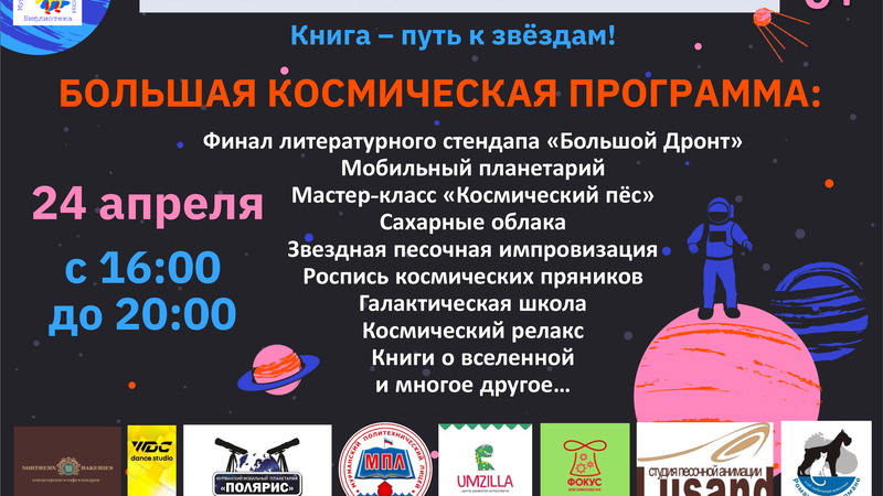 Вечер в библиотеке – отличный повод стать немного учёным, немного первооткрывателем, немного исследователем. Вас ждет насыщенная познавательно-игровая программа для всей семьи. Путешествуйте по книжной галактике вместе с нами и выполняйте задания увлекательной квест-игры, создайте свою космическую кружку и вытащите счастливый звездный билетик в розыгрыше призов, примите участие в забавной фотосессии с космическим псом и полюбуйтесь галактической песочной импровизацией.