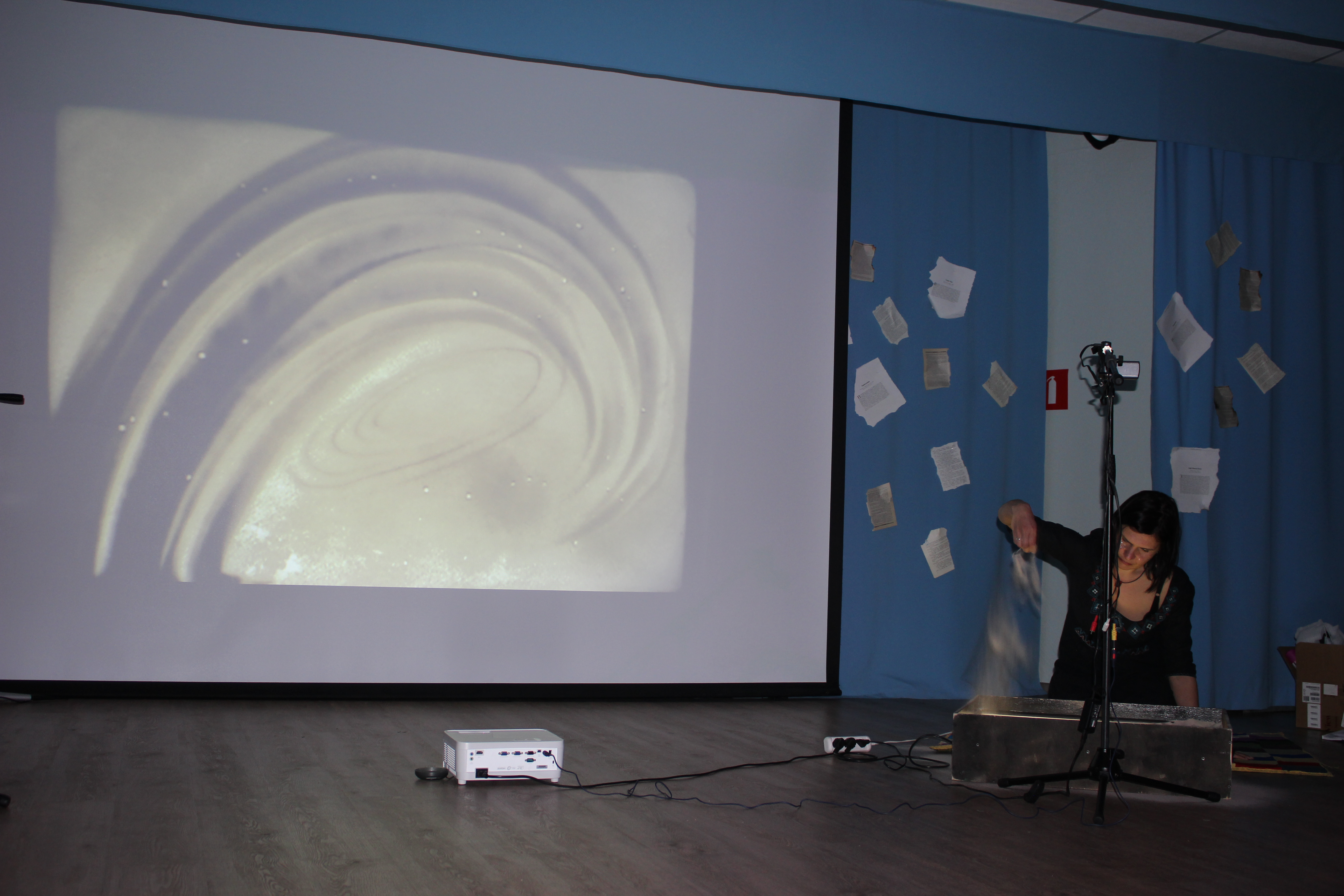 А в мультимедийном зале состоялся праздничный концерт «Поехали!» с участием песочного шоу «Космические импровизации» Людмилы Семеновой в сопровождении музыкального проекта АТМА.