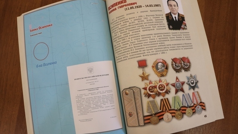 - «банка Осипенко» и «банка Перегудова» названы в память о командире первой отечественной атомной подводной лодки «Ленинский комсомол» контр-адмирале Осипенко Леониде Гавриловиче и ее главном конструкторе Перегудове Владимире Николаевиче;