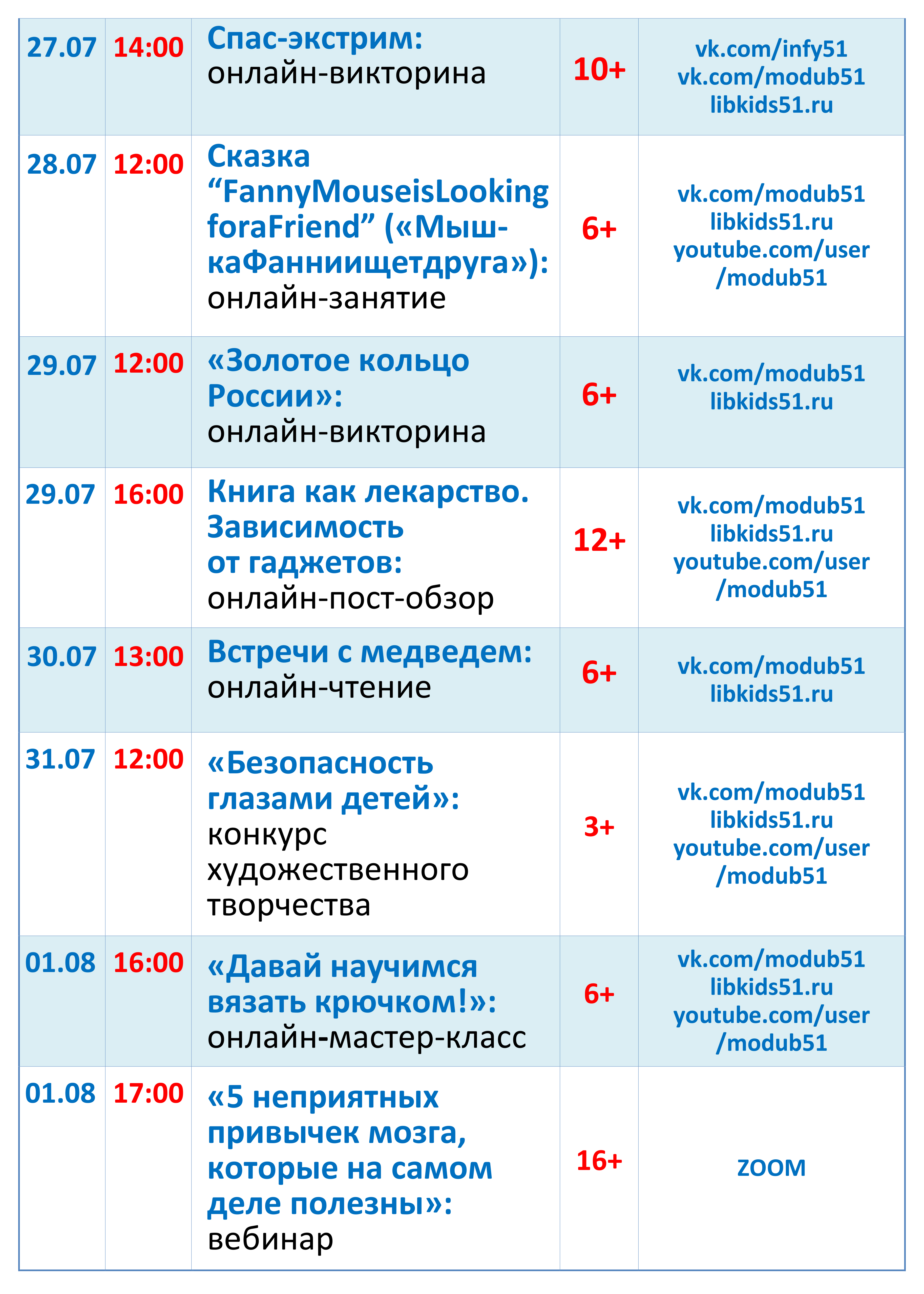 На этой неделе сотрудники Мурманской областной детско-юношеской библиотеки имени В. П. Махаевой (ул. Буркова, д. 30) подготовили насыщенную и разнообразную программу онлайн-мероприятий. Для посетителей сайта пройдут онлайн-чтения, видеообзоры, очередное занятие из цикла «Читаем по-английски!», мастер-класс. Подписчики смогут принять участие в онлайн-игре, конкурсах и проверить знания, ответив на вопросы викторин.