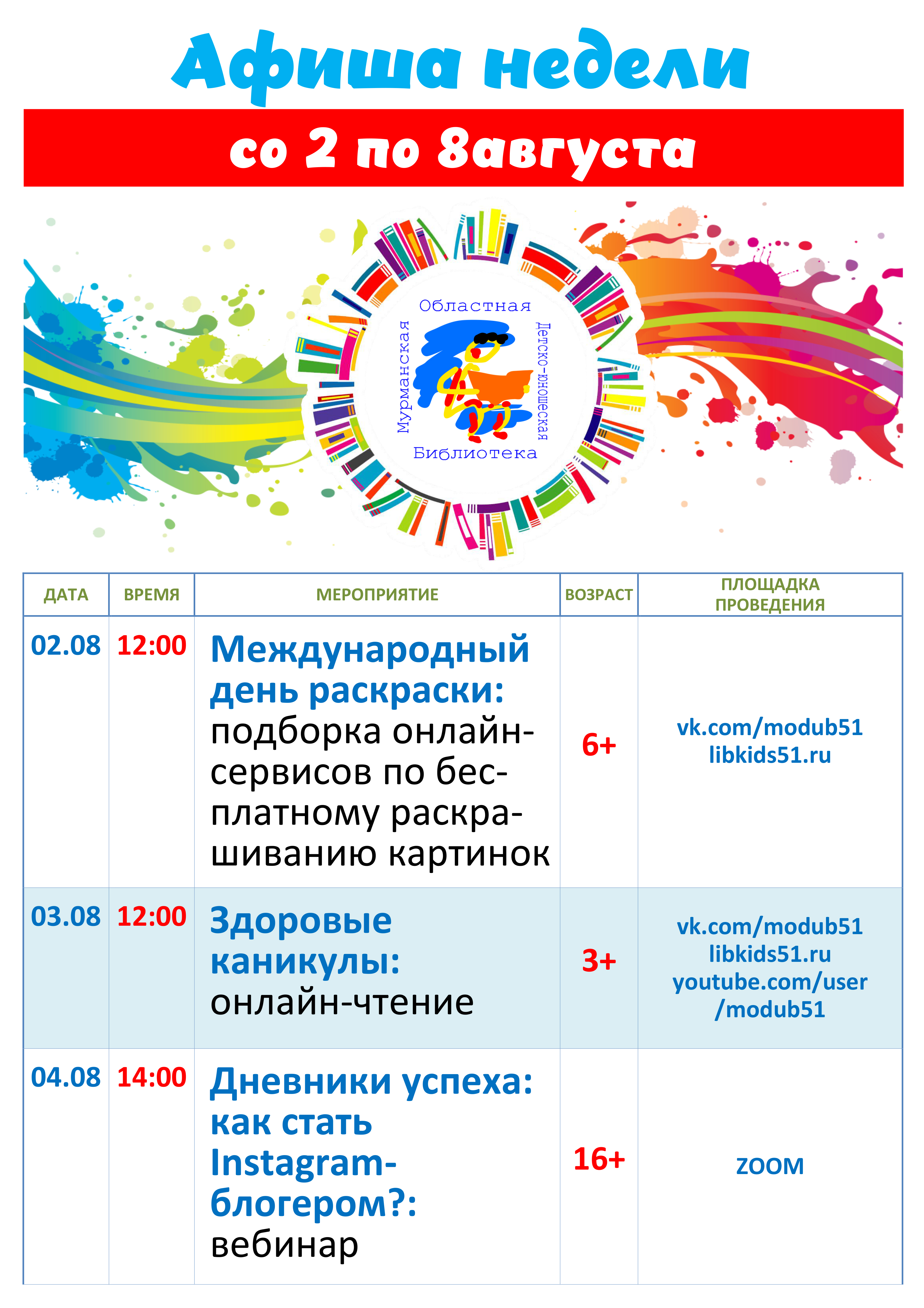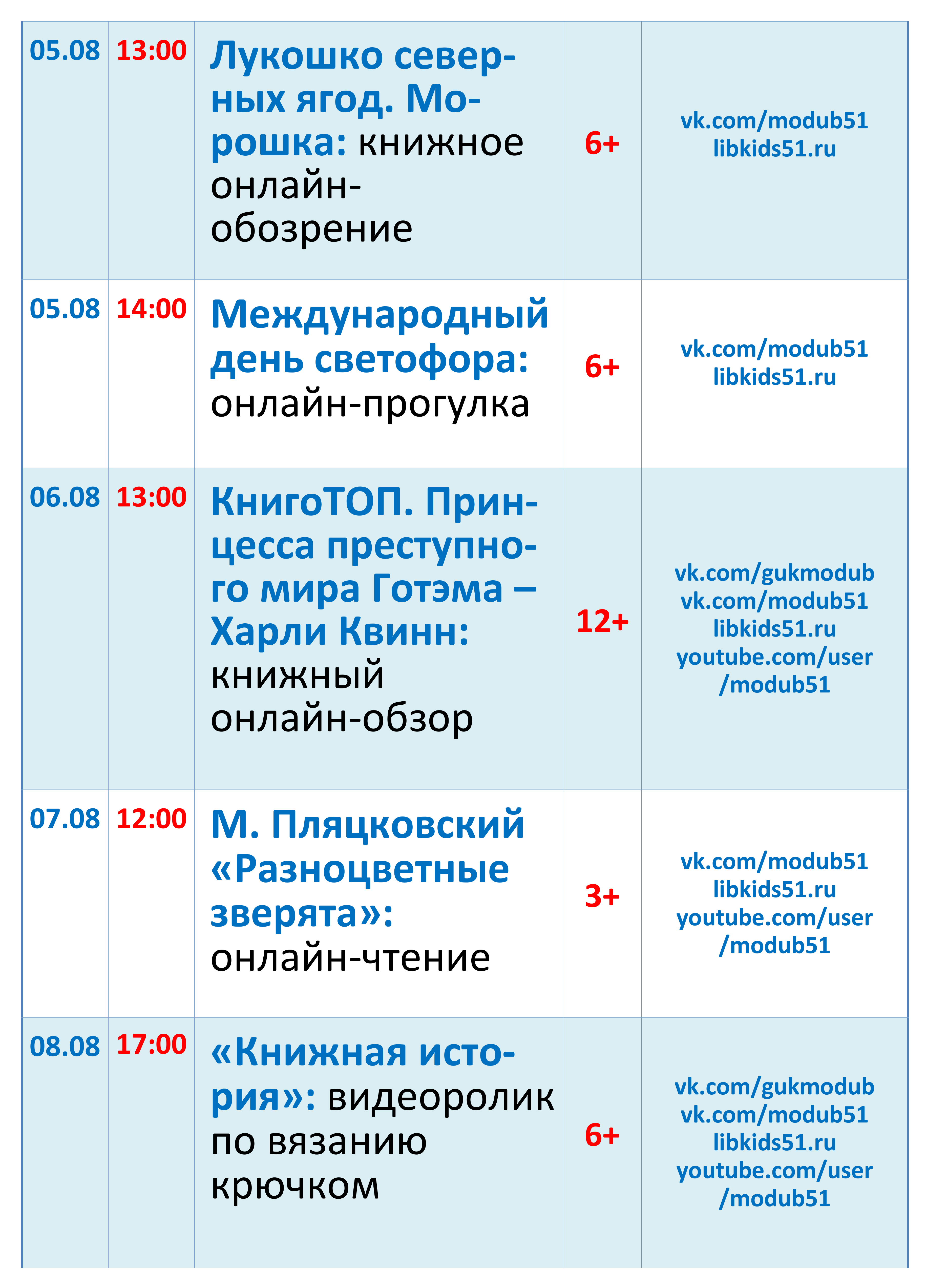 На этой неделе сотрудники Мурманской областной детско-юношеской библиотеки имени В. П. Махаевой (ул. Буркова, д. 30) подготовили насыщенную и разнообразную программу онлайн-мероприятий. Для посетителей сайта пройдут онлайн-чтения, увлекательный книжный обзор о харизматичной Харли Квинн, вебинары, желающие смогут совершить занимательную онлайн- прогулку по истории светофора, посмотреть обучающие видеоролики и принять участие в викторине.