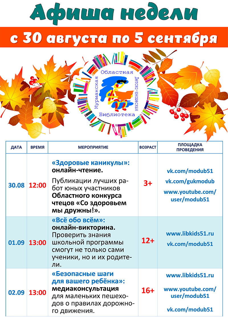 До 31 августа проходит фоточеллендж #Собери_их_всех, Областной конкурс отзывов «Отзывчивый читатель», Конкурс творческих работ «Моя идея в кейс путешественника». До 5 сентября все желающие могут принять участие в межрегиональном творческом фестивале «Лето. Дети. Книга». До 15 сентября областная детско-юношеская библиотека имени В. П. Махаевой принимает работы от участников областного литературного конкурса «105 слов о любимом городе» к юбилею Мурманска. До 5 октября продолжается прием работ на новый сезон творческого проекта «СуперКлассики». Подробности на сайте.