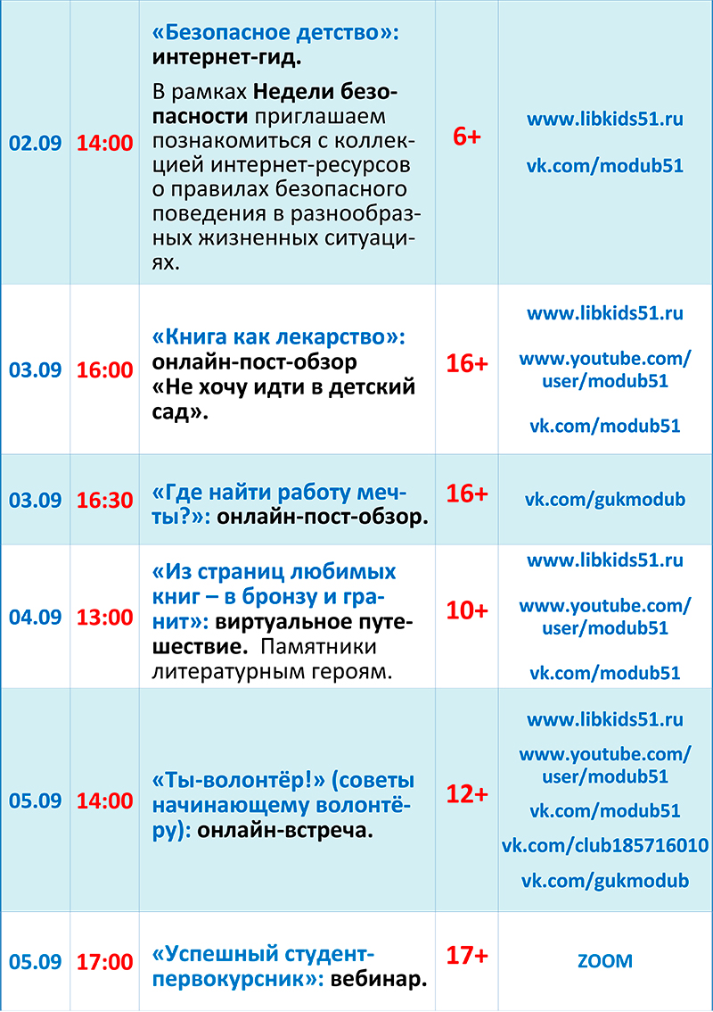 Сотрудники библиотеки приглашают послушать на сайте онлайн-чтения, онлайн-консультацию, тематические онлайн-обзоры, совершить виртуальное путешествие, ответить на вопросы онлайн-викторины ко Дню знаний, принять участие в вебинаре и онлайн-мероприятиях в рамках Недели безопасности.