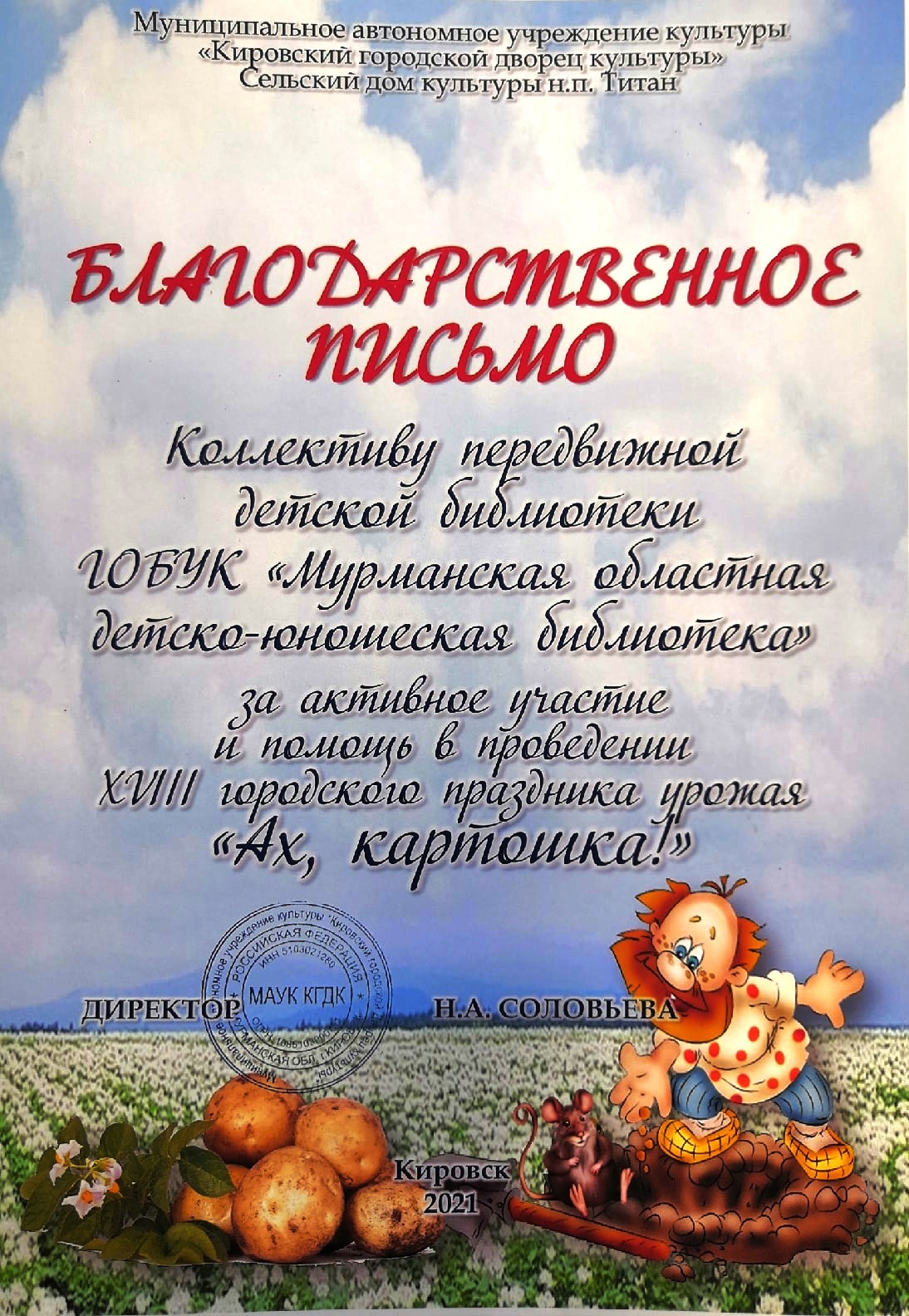 Коллективу передвижной детской библиотеки за активное участие и помощь в проведении городского праздника вручили Благодарственное письмо от Кировского городского дворца культуры.