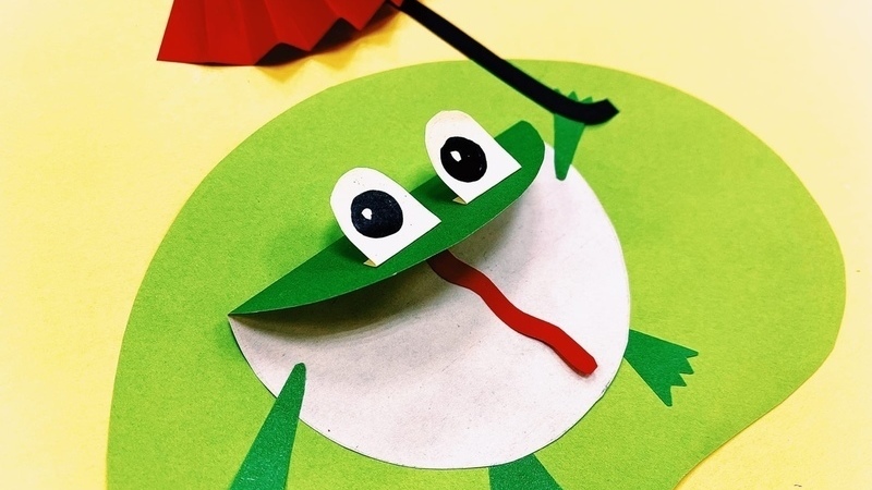 Из очень простых деталей сделаем необычную, интересную аппликацию! Вырежем круги и треугольники, приклеим на импровизированный лист кувшинки и далее – на фон. Не забудем вручить лягушонку зонтик и забрать с собой хорошее настроение!
