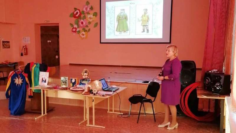 Ребятам был продемонстрирован настоящий саамский костюм. Это платье носила саамская писательница Надежда Большакова, а создала его модельер-дизайнер Лисина Валентина Константиновна*.