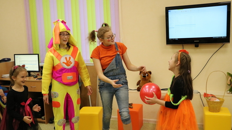 В зале «Счастливое детство» царила праздничная, сказочная атмосфера. Наши волонтеры в костюмах любимых героев организовали яркую программу и веселое мини-диско. Детвора вместе с Пеппи Длиннымчулком, Маленькой Разбойницей и Симкой водили хороводы, кормили щенка, танцевали под зажигательные хиты, пели песни. С восторгом маленькие озорники ловили лимонадный дождь. И даже научились медитировать!