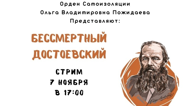 Достоевский вечен, и сколько бы времени ни прошло, проблемы, которые он поднимал в своих произведениях, будут актуальны всегда. К тому же в 2021 году отмечается 200-летие со дня рождения Федора Михайловича, поэтому творческая группа стримеров «Орден Самоизоляции», разумеется, не могла обойти столь знаменательную дату стороной. В этот раз, помимо основного состава, участвовать в диалоге будет кандидат филологических наук, доцент и первоклассный специалист в области литературоведения Ольга Владимировна Пожидаева!
