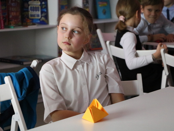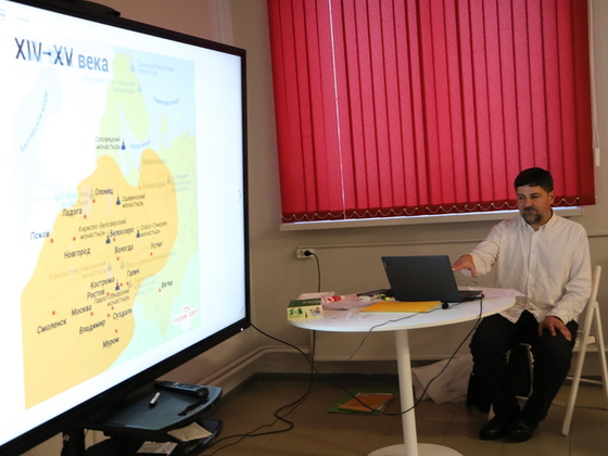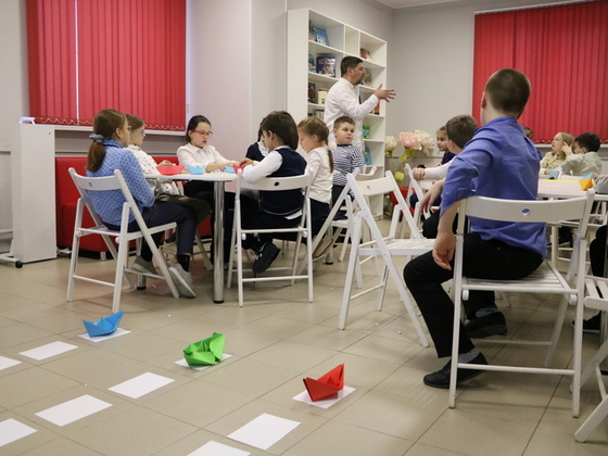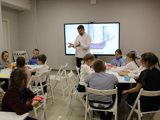Тимофей Пискунов провел несколько активных игр. Он предлагал гимназистам поиграть в «рыбную игру»: получив карточки с названием одной из рыб (палтус, семга, треска), не договариваясь соединиться в стаи. Далее ученики узнавали основные части лодки поморов – карбаса, и сами создавали его из бумаги. «Стаи»-команды выбирали кормчего, который должен был собрать большой карбас быстрее всех. После успешного выполнения команды участвовали в поморской регате: угадывали, что из себя представляет баюнок, кроткая вода, гнус амбарный, зуек и кошка.