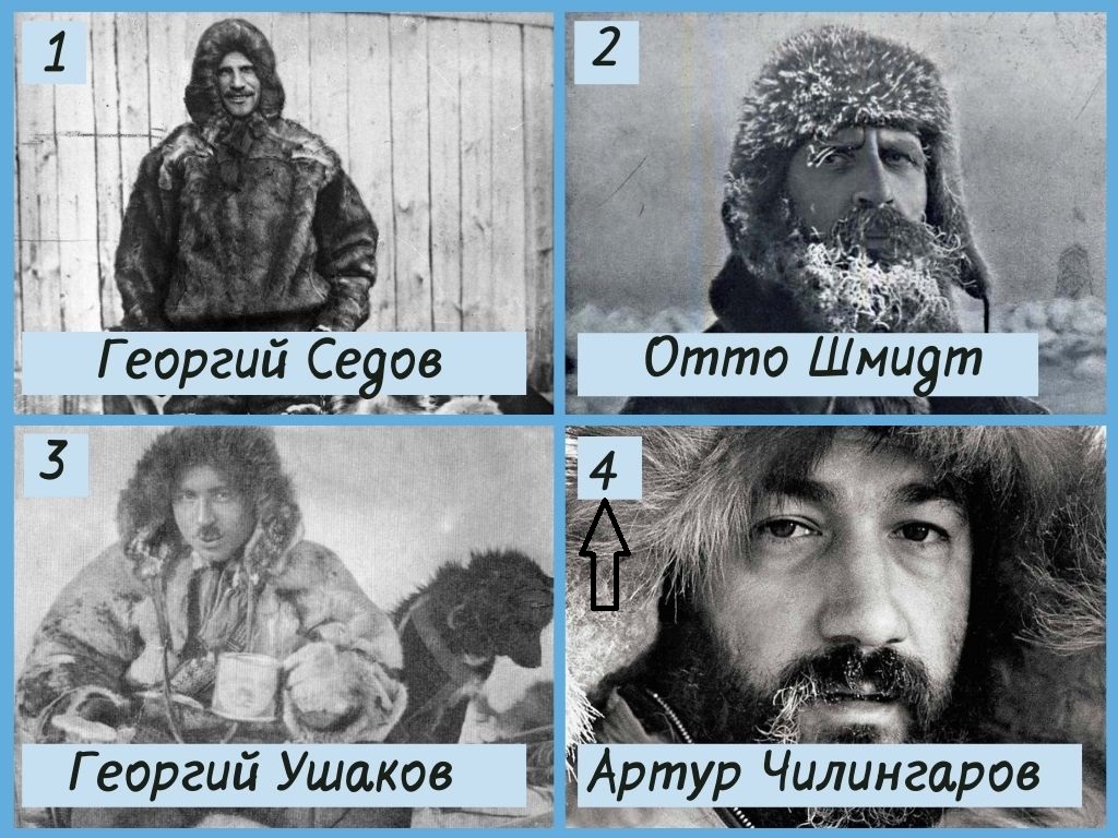 1.1 Перед вами известные отечественные исследователи Севера. Только одному из них удалось побывать на Северном полюсе. Кому именно? Выберите один вариант ответа.