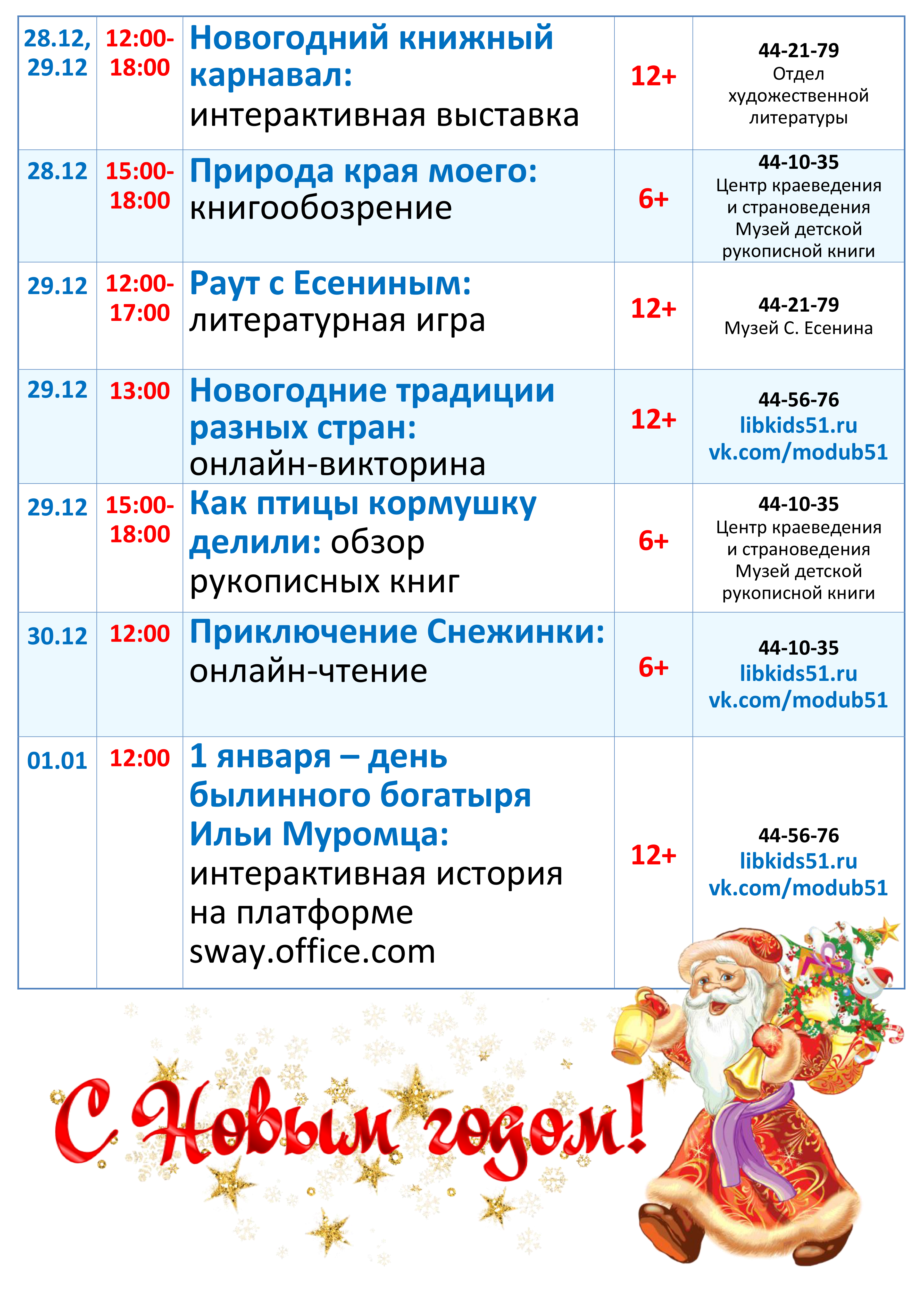 Уважаемые посетители, знакомьтесь с программой мероприятий, проводимых в библиотеке с 27 декабря 2021 г. по 02 января 2022 г