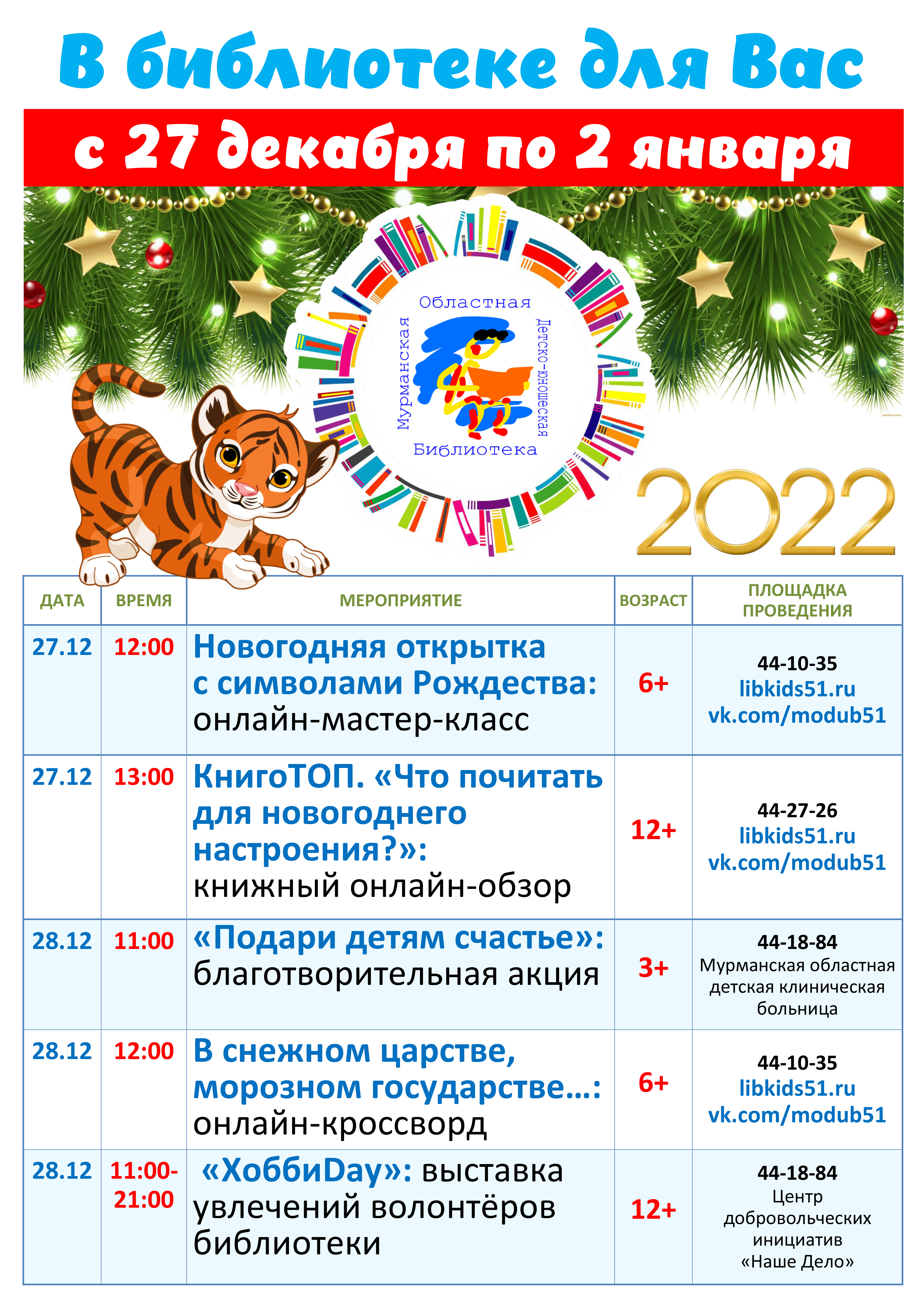 Уважаемые посетители, знакомьтесь с программой мероприятий, проводимых в библиотеке с 27 декабря 2021 г. по 02 января 2022 г