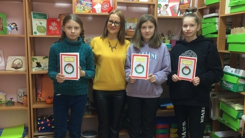 С особым усердием и старанием ребята сворачивали узенькие полоски бумаги в спиральки и придавали им форму «стрелка». В результате у юных мастеров получились очень красивые, изящные открытки с изображением рождественского венка. Дети в отличном настроении поспешили домой, чтобы подарить родным свои творения.