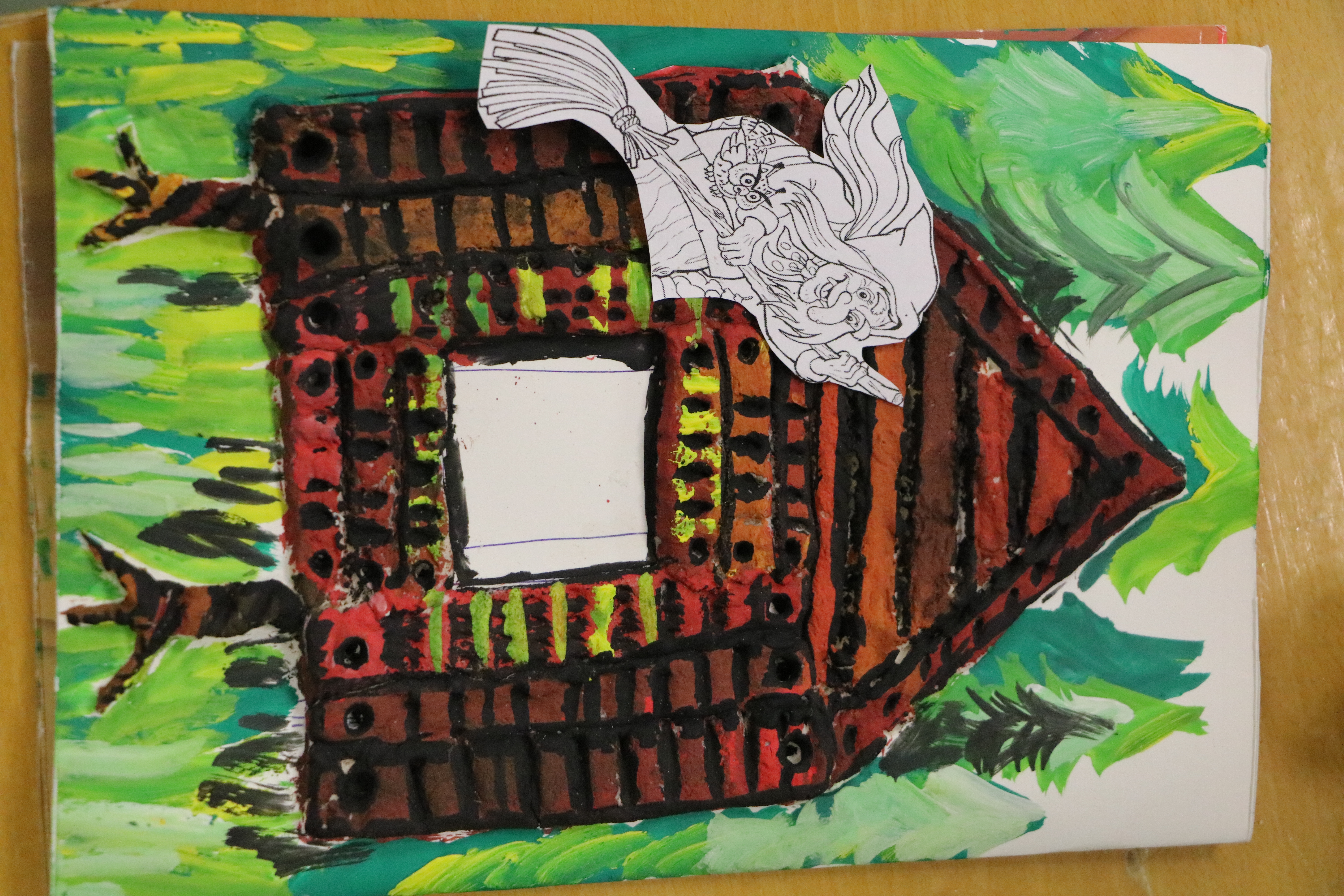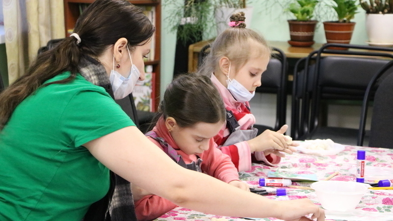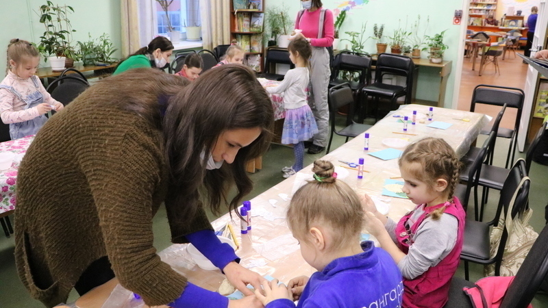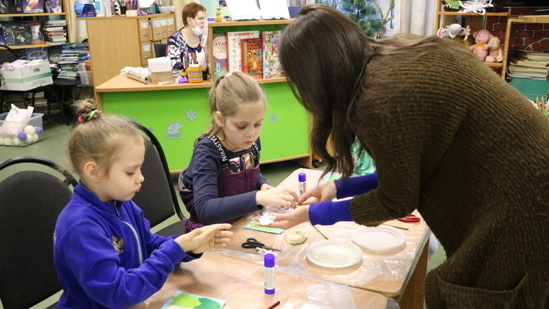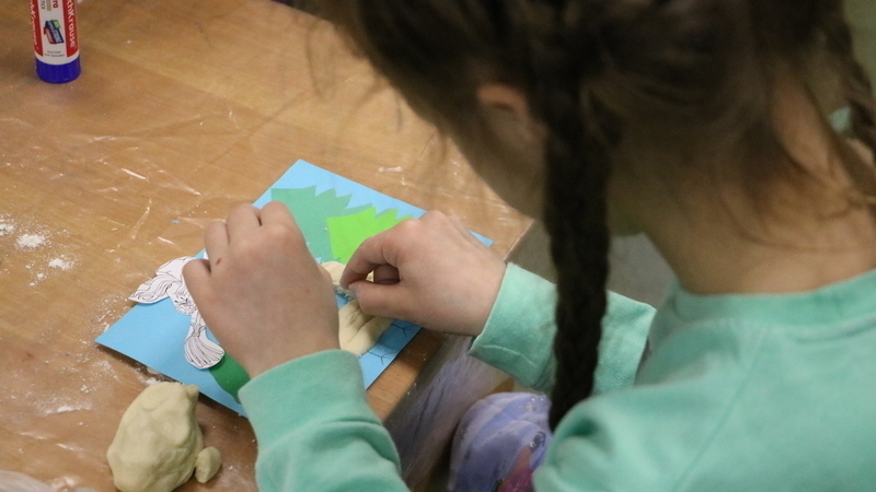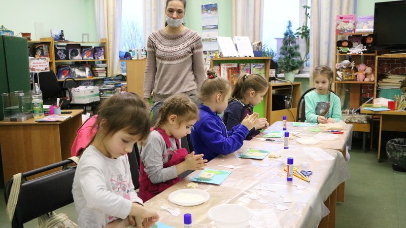 Юные читатели мастерили лесную избушку из очень своеобразного материала – теста. Из пластичной, мягкой, податливой массы с помощью небольшого количества муки дети слепили «бревнышки», используя зубочистки для резки, придали им правильную форму и приклеили брусочки к бумаге.