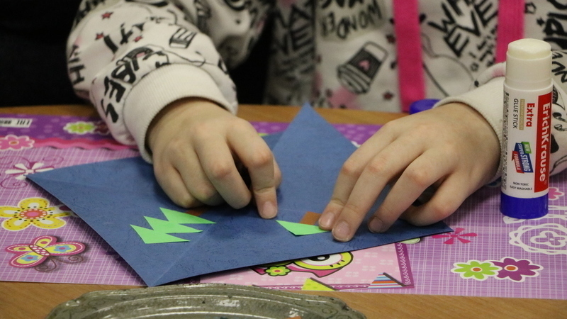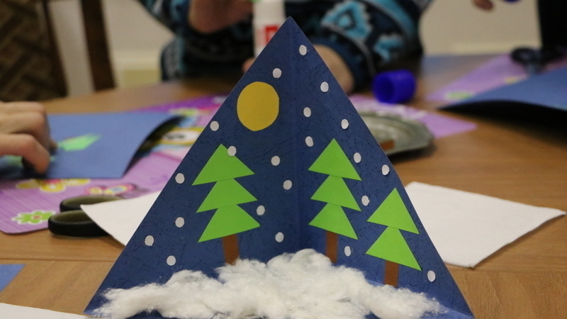 Вначале ребята, поприветствовав друг друга, сделали пальчиковую гимнастику «Мы с тобой снежок слепили». А потом с помощью картона, цветной бумаги, ваты и клея создали красивую поделку на зимнюю тему. У каждого на открытке произошло волшебство: засверкал, заискрился блестками белый снег.