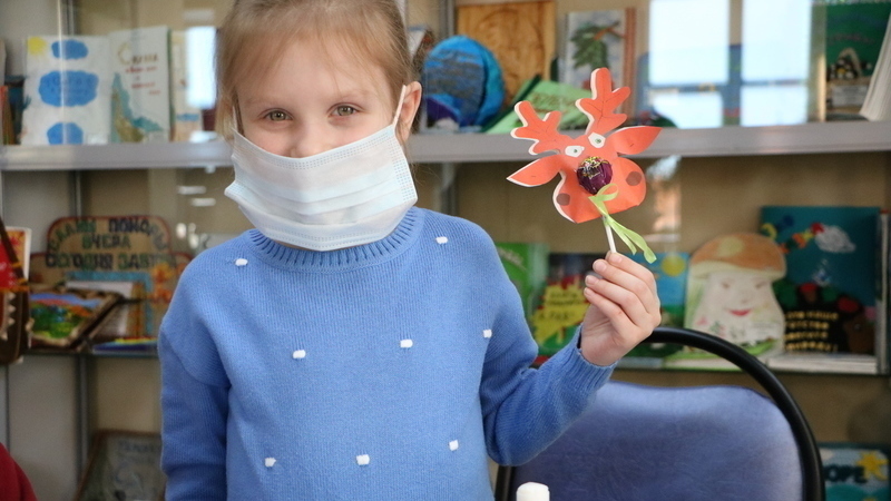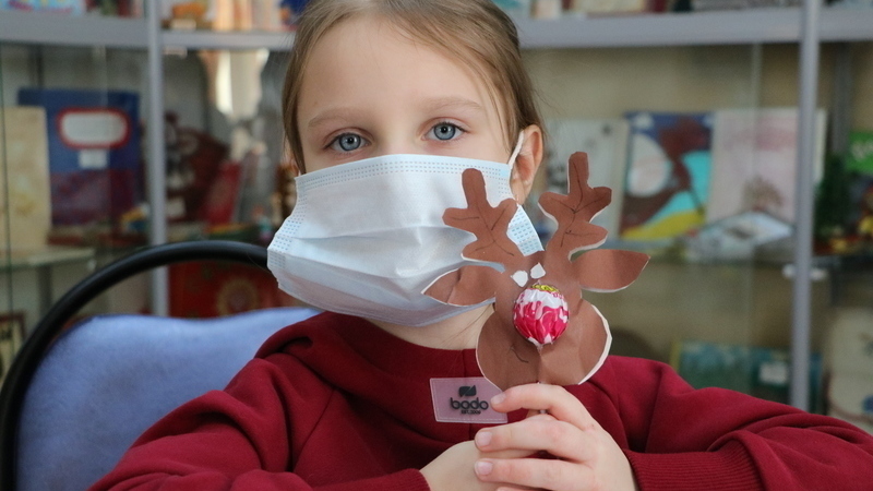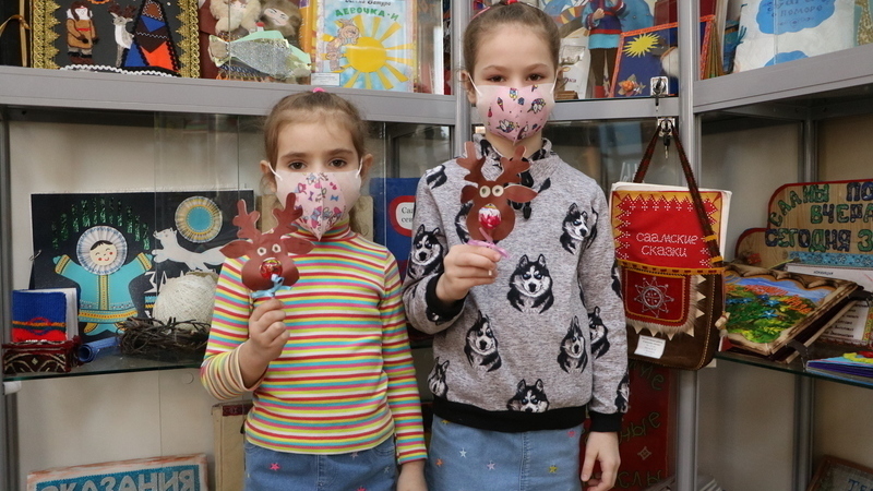 Ребята вырезали голову и рожки этого животного по контуру, оформили глаза и ушки оленю при помощи карандашей и фломастеров. Нос у лесного зверя получился необычный, а все дело в том, что для его создания дети использовали конфету чупа-чупс на палочке. В завершении своей работы ребята завязали животному бант из цветной ленточки. И олень получился не только веселый и сладкий, но еще и нарядный.