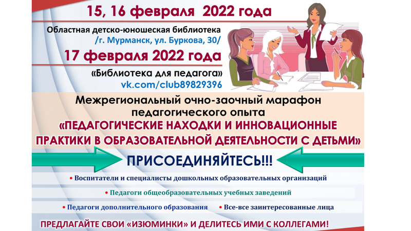 В заочной форме марафон начнет работу 17 февраля 2022 года во «ВКонтакте» в группе «Библиотека для педагога» http://vk.com/pedagog_libkids51. Начало марафона в 13:00.