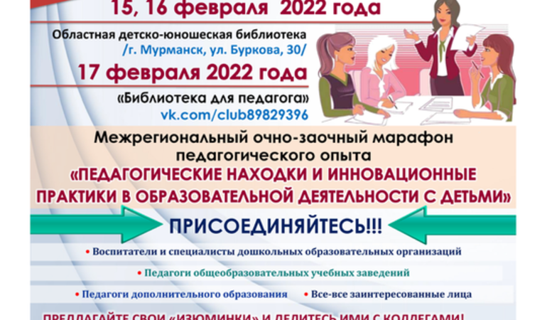 В заочной форме марафон начнет работу 17 февраля 2022 года во «ВКонтакте» в группе «Библиотека для педагога» http://vk.com/pedagog_libkids51. Начало в 13:00.