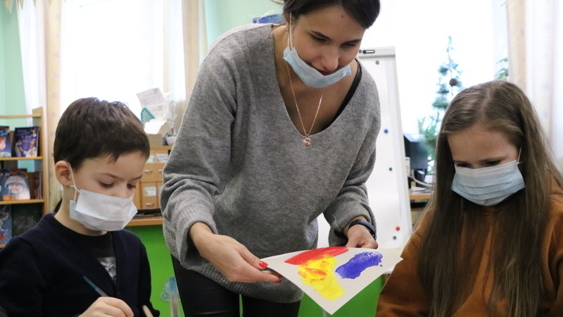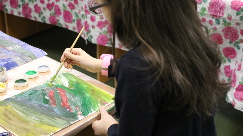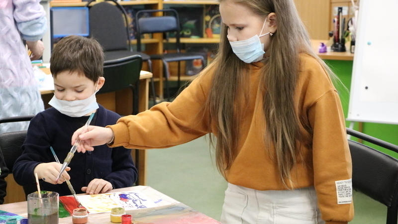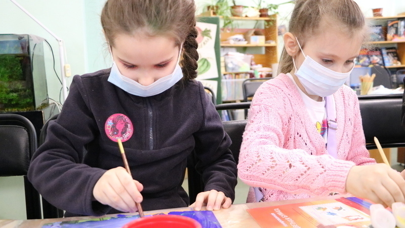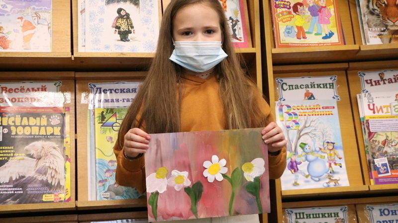 Занятие творческой мастерской было приурочено к яркому празднику – Дню смешивания красок. Юные художники добавляли на холст любимые цвета и при помощи умелого смешивания, под руководством библиотекаря Натальи Эдуардовны, получились живописные палитры, которые послужили основой для создание ромашкового неба.