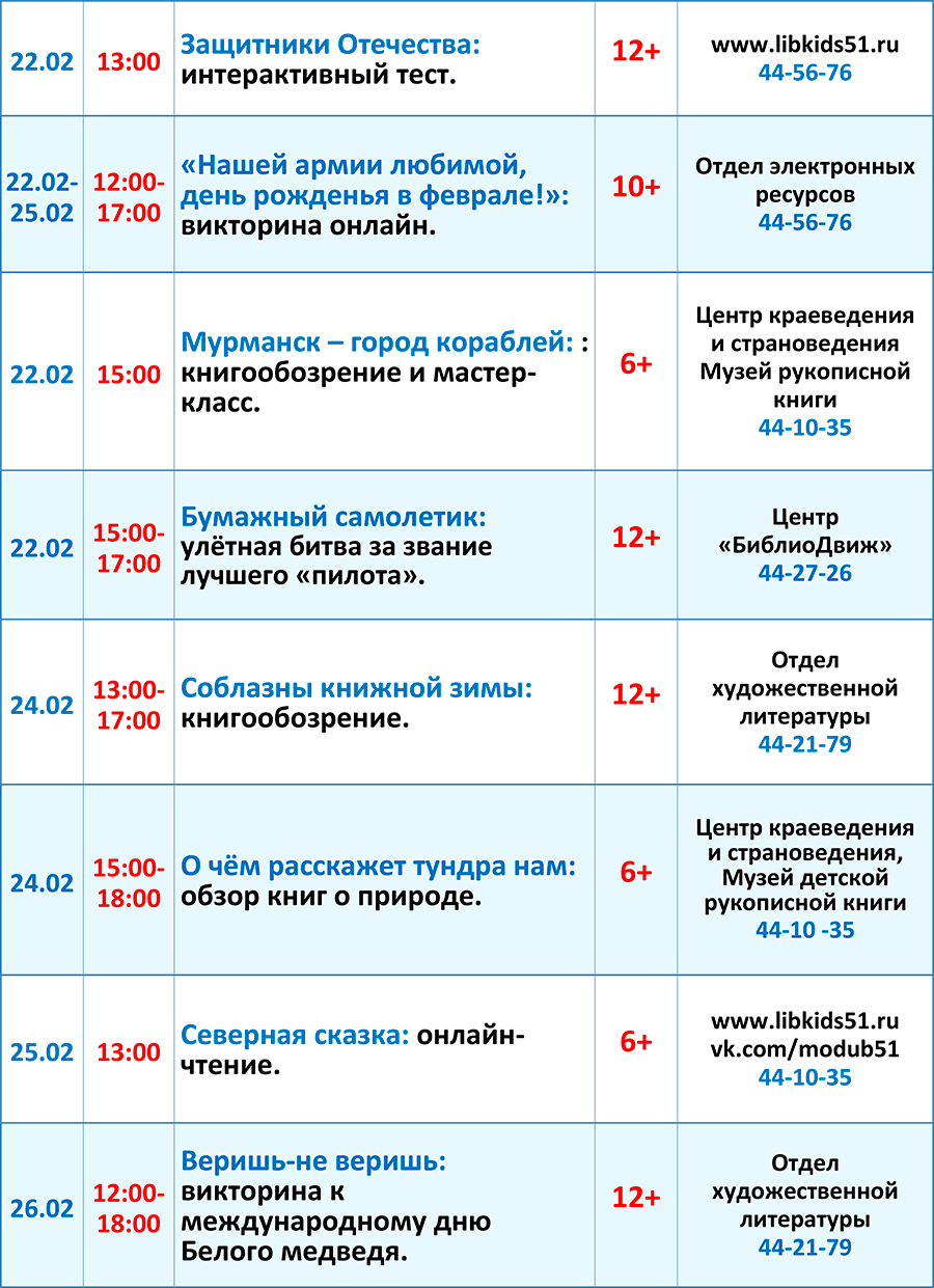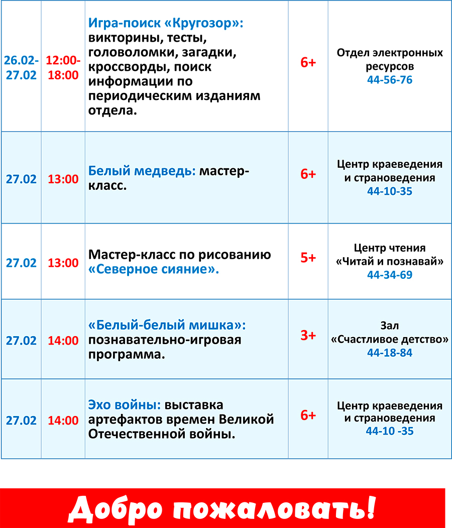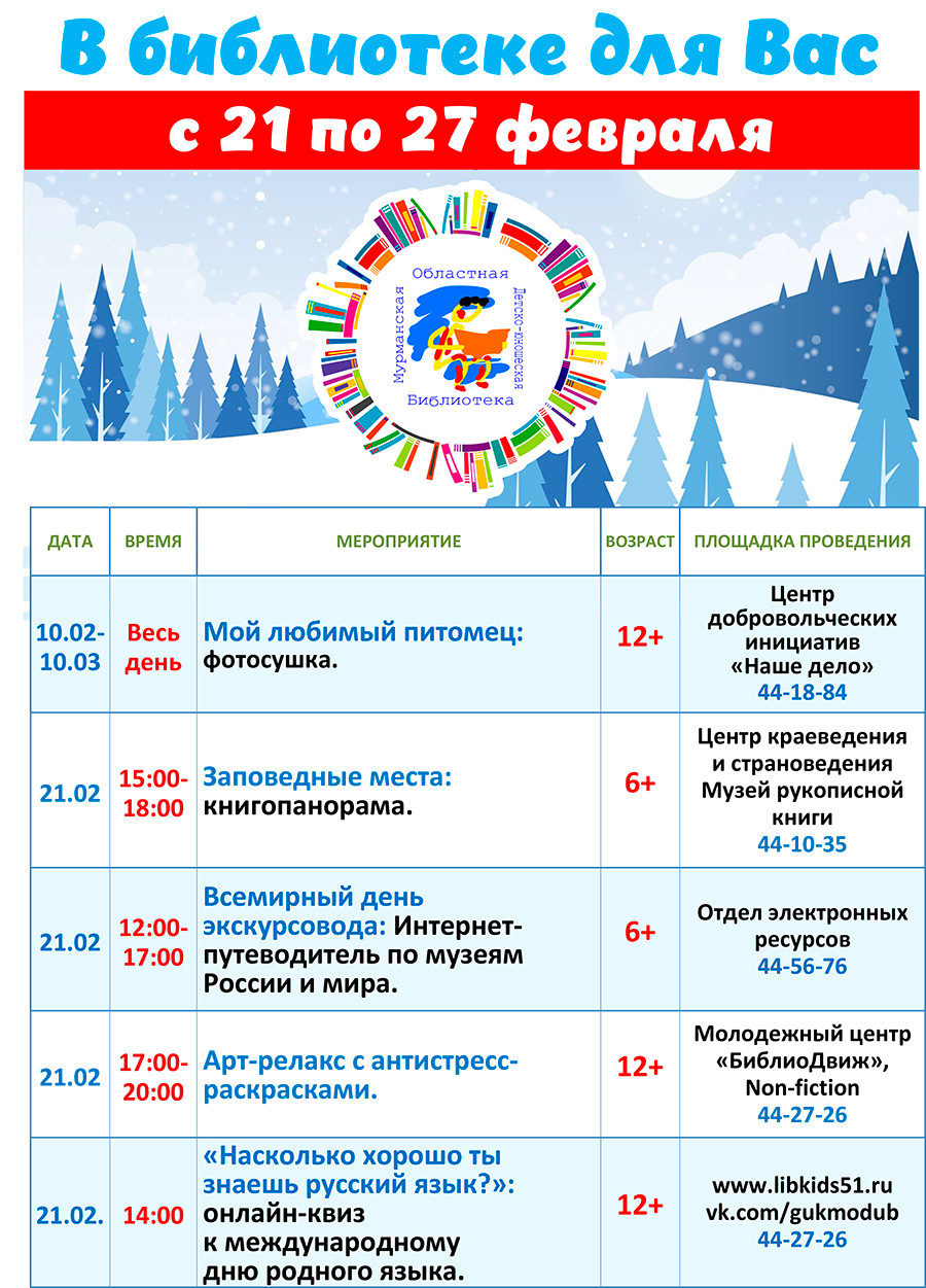 Уважаемые посетители, знакомьтесь с программой мероприятий, проводимых в библиотеке с 21 по 27 февраля