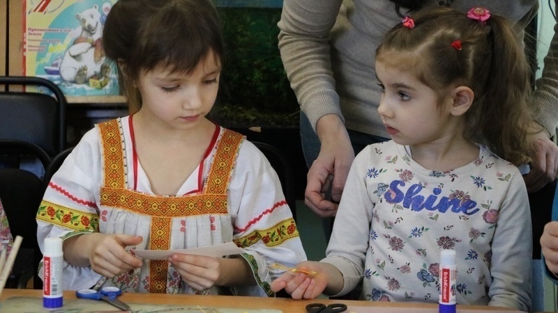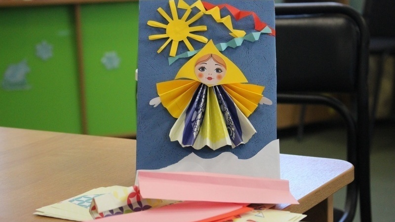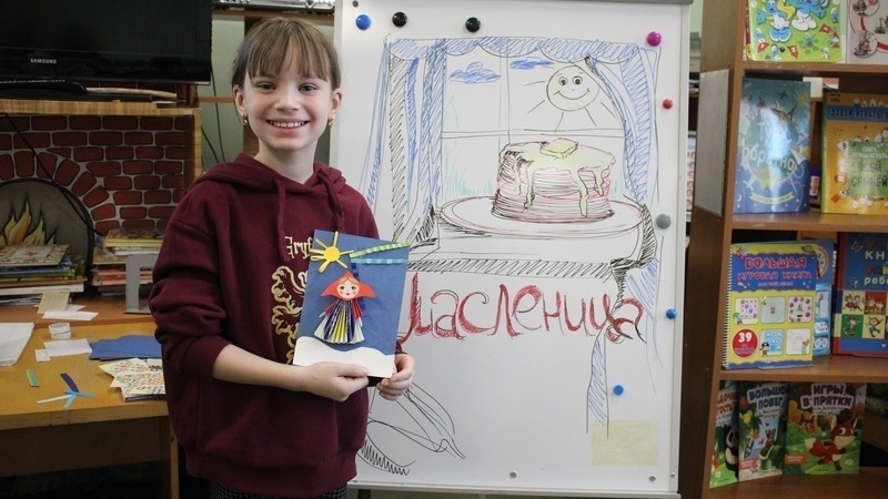 На творческом занятии ребята делали из цветной бумаги саму Масленицу. Да не просто куклу, а еще и с солнышком, снегом и разноцветными ленточками!