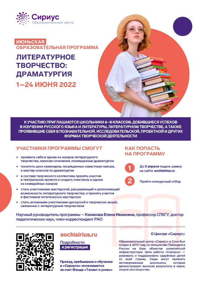 В Образовательном центре «Сириус» (г. Сочи), созданном по инициативе Президента Российской Федерации В. В. Путина в целях выявления, поддержки и дальнейшего сопровождения талантливых детей нашей страны, с 1 по 24 июня 2022 года будет реализована образовательная программа «Литературное творчество: Драматургия» по направлению «Искусство» для школьников 6-8 классов.