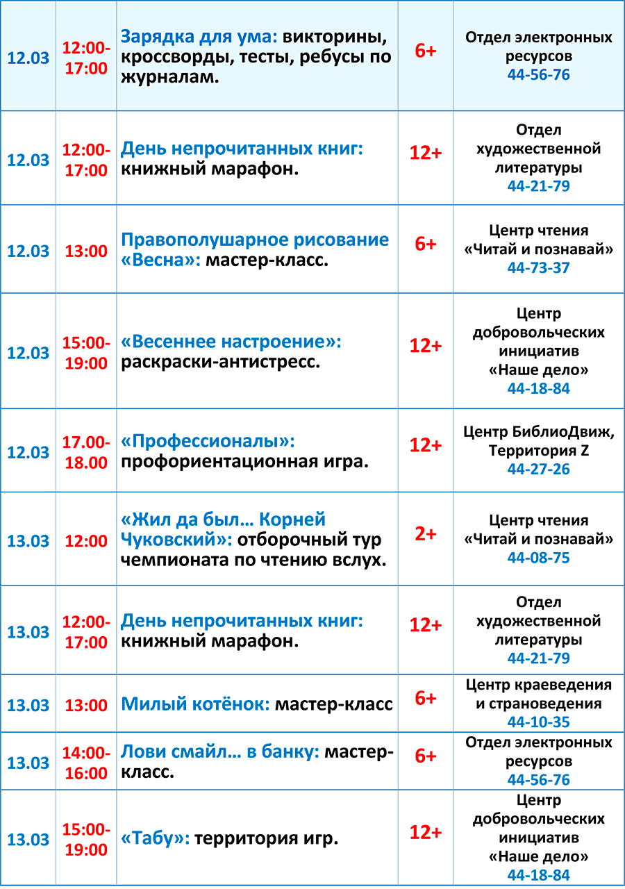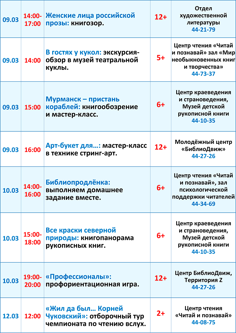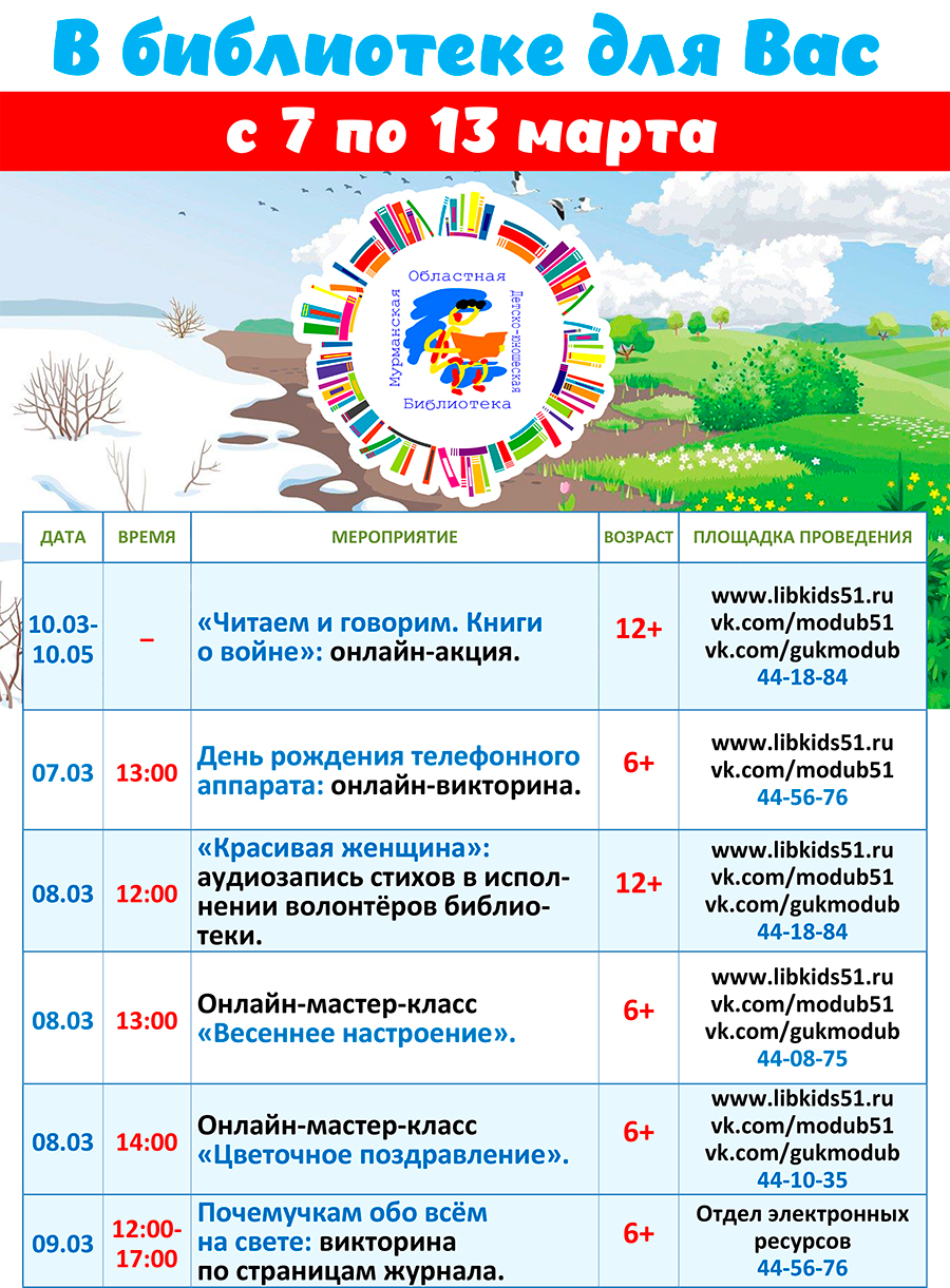 Уважаемые посетители, знакомьтесь с программой мероприятий, проводимых в библиотеке с 7 по 13 марта