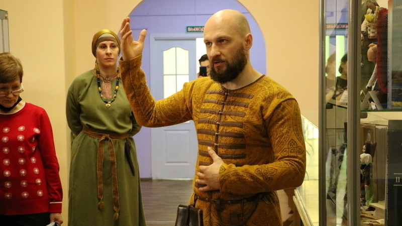 В рамках презентации гости из Североморска – Оксана Леонидовна и Андрей Сергеевич Коляда познакомили присутствующих с предметами экспозиции за стеклом «Палитра ремесел», дополняющей основную часть комплексной выставки. Они рассказали о костюмах народов, проживающих на территории Древней Руси эпохи викингов: ильменских словен, финно-угорских, балтских, адыго-аланских племён и некоторых других народностей, о ремёслах связанных с созданием одежды в эпоху раннего средневековья. Были показаны элементы материальной культуры, комплекты реконструированной одежды новгородских жителей, проведен мастер-класс по средневековой настольной игре «Мельница».