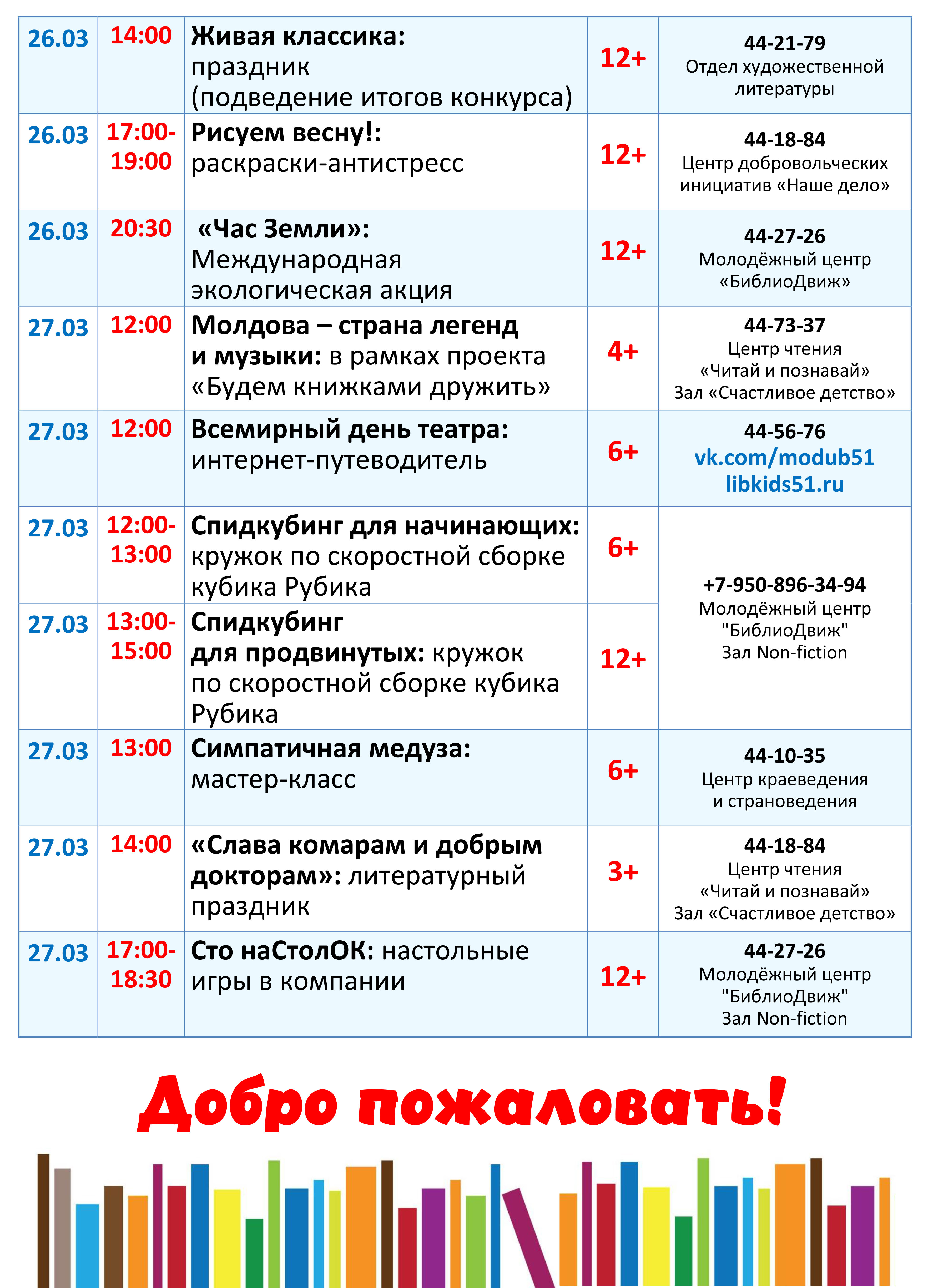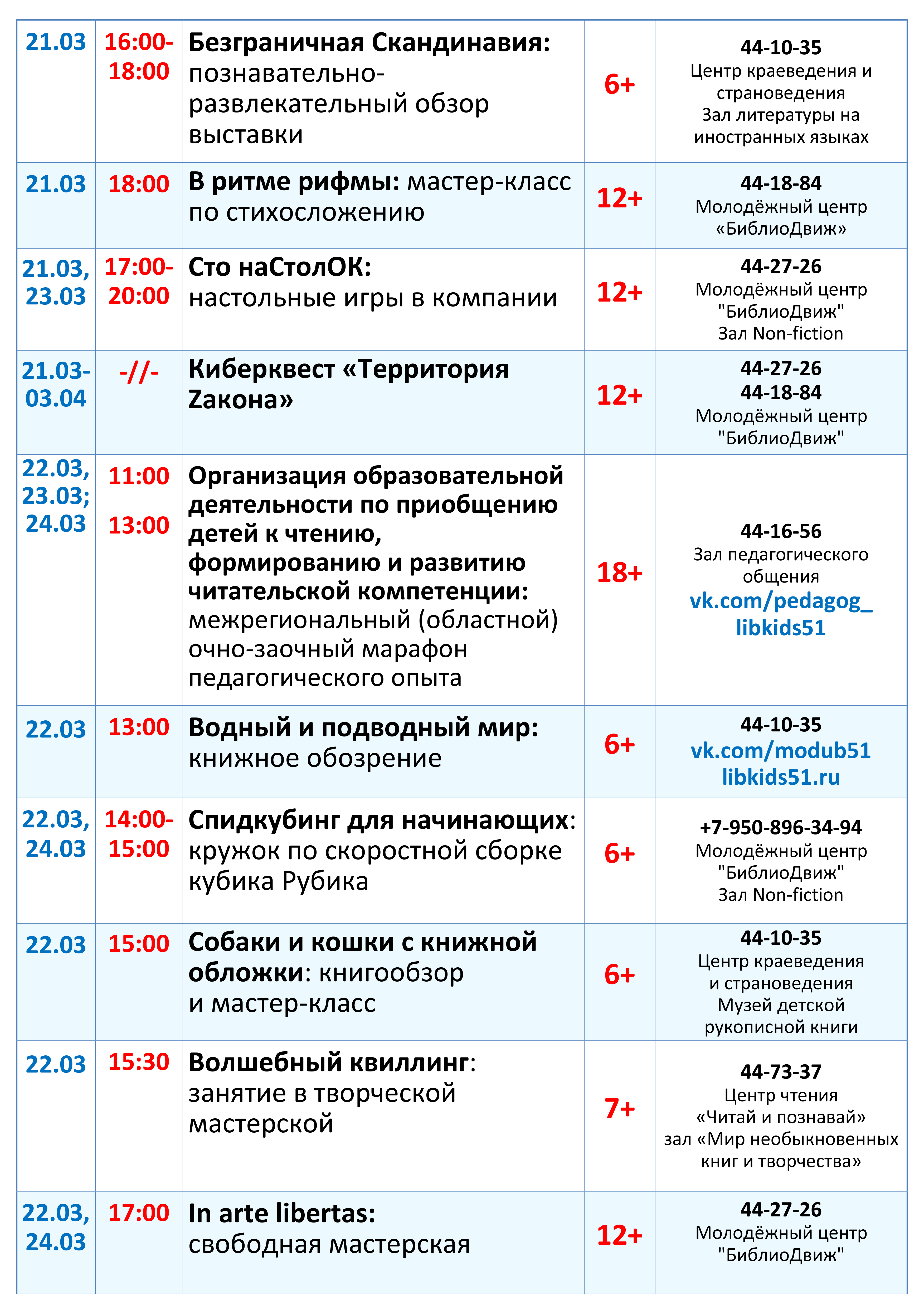 В стенах библиотеки читателей также ждут разнообразные и увлекательные мероприятия: спидкубинг для начинающих и продвинутых, киберквест «Территория Zакона», финал Чемпионата по чтению в слух и очередная встреча по проекту «Будем книжками дружить».
