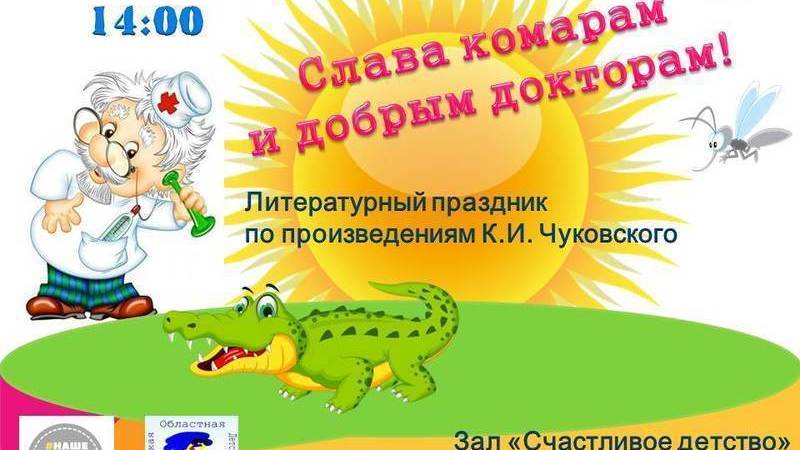 Юные читатели библиотеки встретятся с любимыми персонажами произведений именитого автора: доктором Айболитом, крокодилом, Федорой и др. Ребята поучаствуют в веселых соревнованиях на лучшее знание произведений К.И. Чуковского, забавных эстафетах и танцах, выполнят полезную зарядку от Айболита и получат угощение от Мухи-цокотухи.