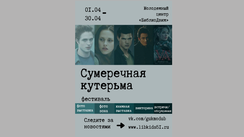 Цикл романов Стефани Майер о любви между вампиром и обычной девушкой известен во всем мире. «Сумерки» любят и ненавидят, восхищаются и считают глупым чтением для инфантильных девочек. Но специалисты молодежного центра докажут вам обратное. Что в книгах заложен хороший и правильный посыл, что в фильмах есть своя эстетика, что Роберт Паттинсон отличный актер, да и просто красавчик. Предлагаем и нашим читателям окунуться в этот фантастический мир и посетить встречи и обсуждения, которые пройдут в течение месяца. Библиотекари призывают не относиться к этому слишком серьезно, даже если вы ярый поклонник Эдварда Каллена или Джэйкоба, чувство юмора приветствуется. Проведем это время легко, за приятными обсуждениями.