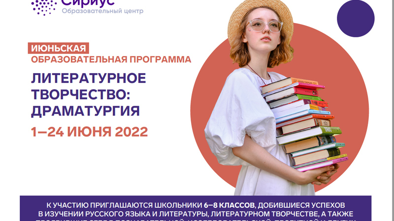 В Образовательном центре «Сириус» (г. Сочи), созданном по инициативе Президента Российской Федерации В. В. Путина в целях выявления, поддержки и дальнейшего сопровождения талантливых детей нашей страны, с 1 по 24 июня 2022 года будет реализована образовательная программа «Литературное творчество: Драматургия» по направлению «Искусство» для школьников 6-8 классов.