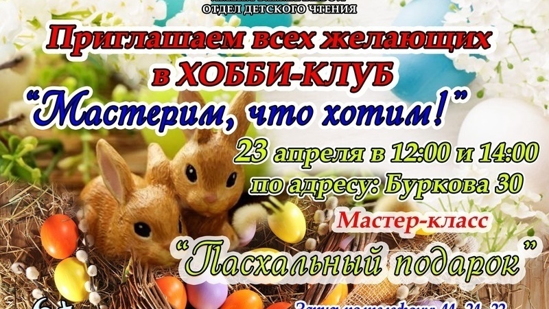 Для юных читателей от шести лет и их родителей пройдет мастер-класс «Пасхальный подарок». На творческом занятии ребята будут делать из цветной бумаги венок с пасхальным кроликом.