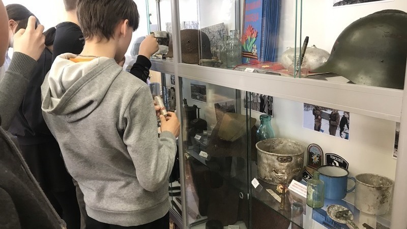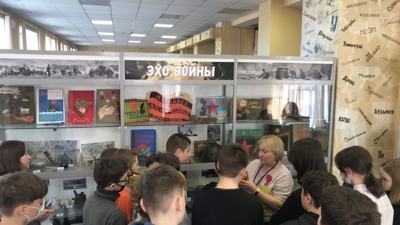 Большой интерес вызвала выставка «Эхо войны», расположенная в центре краеведения и страноведения. В экспозиции представлены артефакты войны, которыми поделились бойцы Мурманского поискового отряда «Долина». Ребятам показали каски немецких и советских воинов, пехотные лопаты, сигнальные ракеты, личные вещи солдат, найденные в советских и немецко-фашистских окопах, а также предметы быта, обнаруженные поисковиками: флакончики от духов, кремов, медицинские бутылочки и банки от консервов.