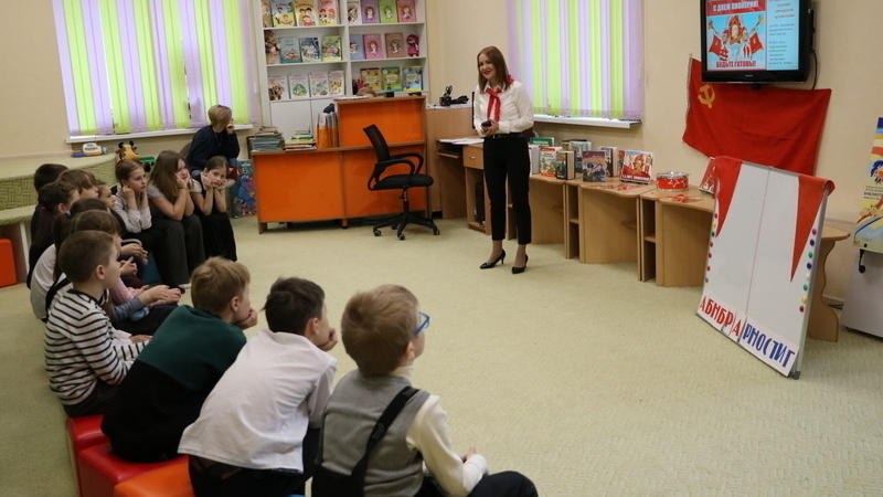 Ребята перенеслись в эпоху красных галстуков и пилоток. Библиотекарь рассказала детям о том, как появилась Всесоюзная пионерская организация, как принимали школьников в пионеры и, как они давали торжественное обещание.